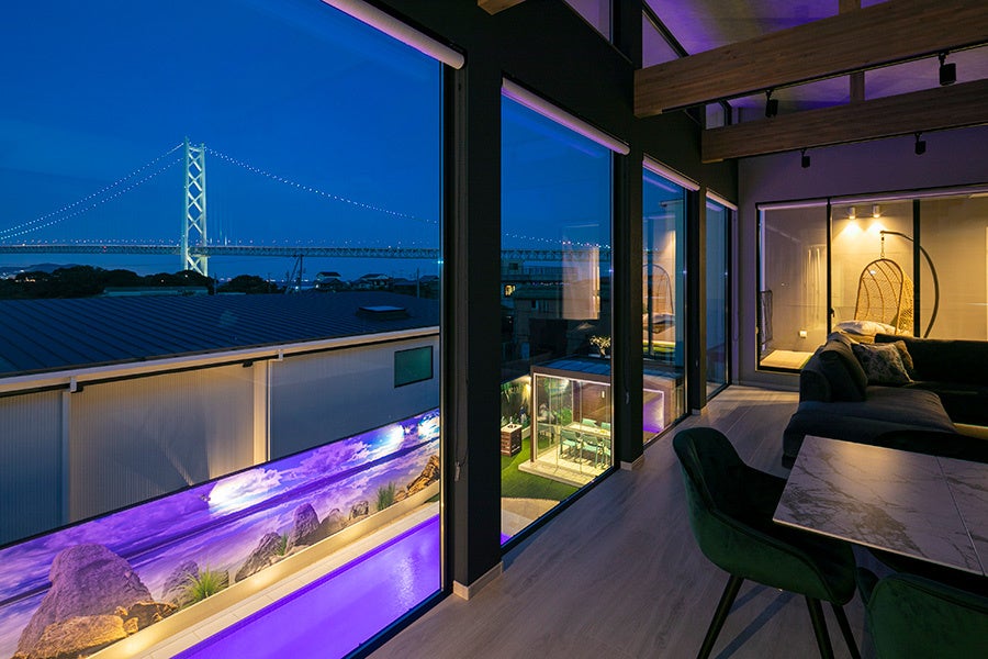 客室の2階部分に位置するリビングスペースからは、ライトアップされた明石海峡大橋を一望する絶景。