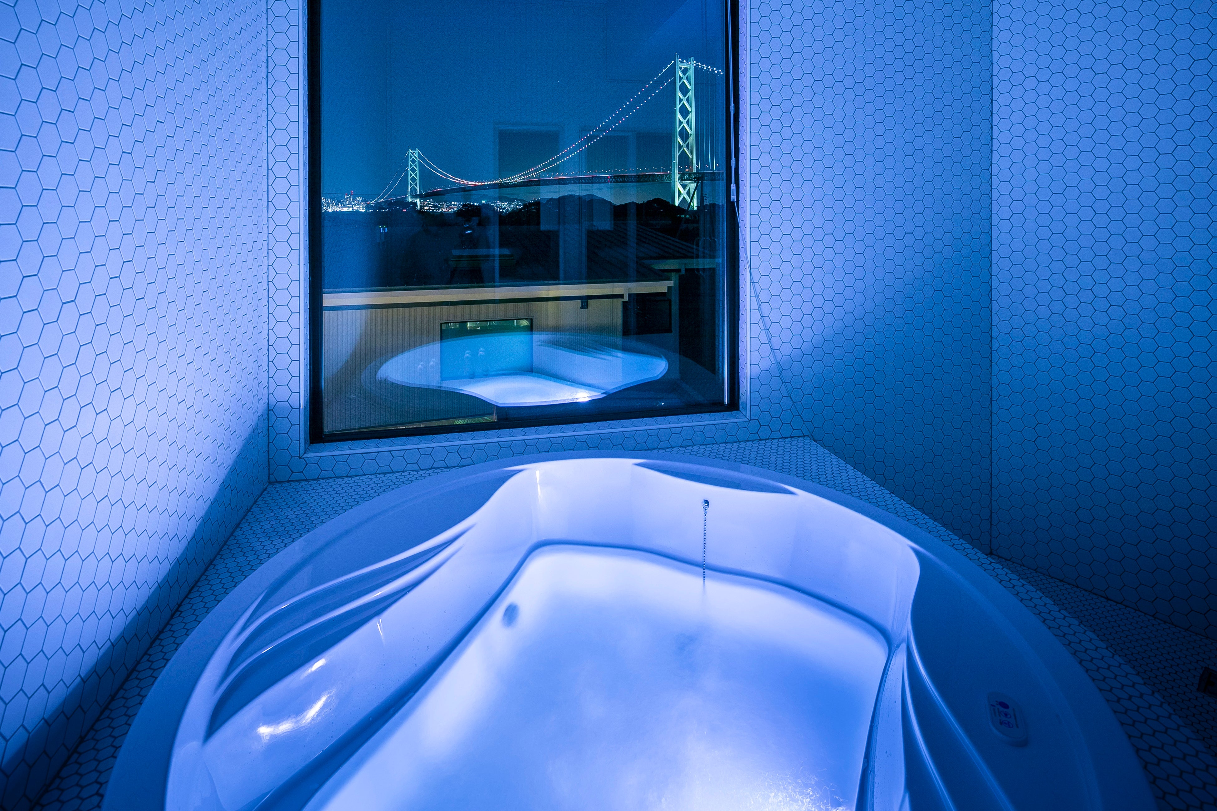 明石海峡大橋を望む眺望の良い2階に、5色に光るイルミネーションジャグジーをご用意。