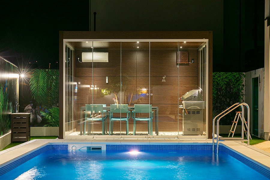 プライベートプールを配置するガーデンには、ガラス張りのBBQスペースをご用意しております。