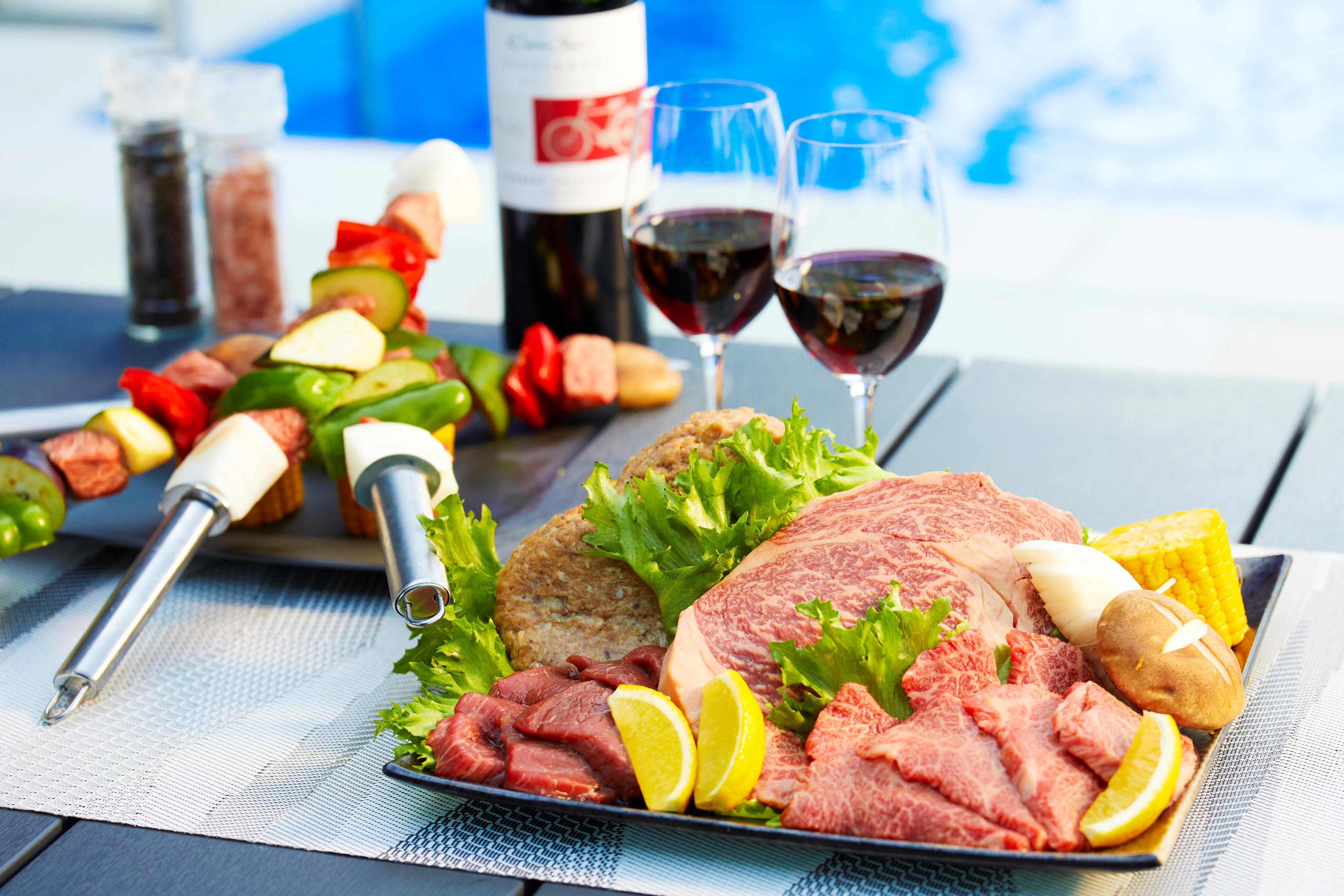 お食事のBBQは専用のグラスガーデン内でご堪能いただけます。宮崎県の有田牧場より取り寄せた”A4ランク宮崎牛”をメインとした、 こだわり抜いた食材をふんだんに使用した贅沢BBQメニューをご用意いたします。