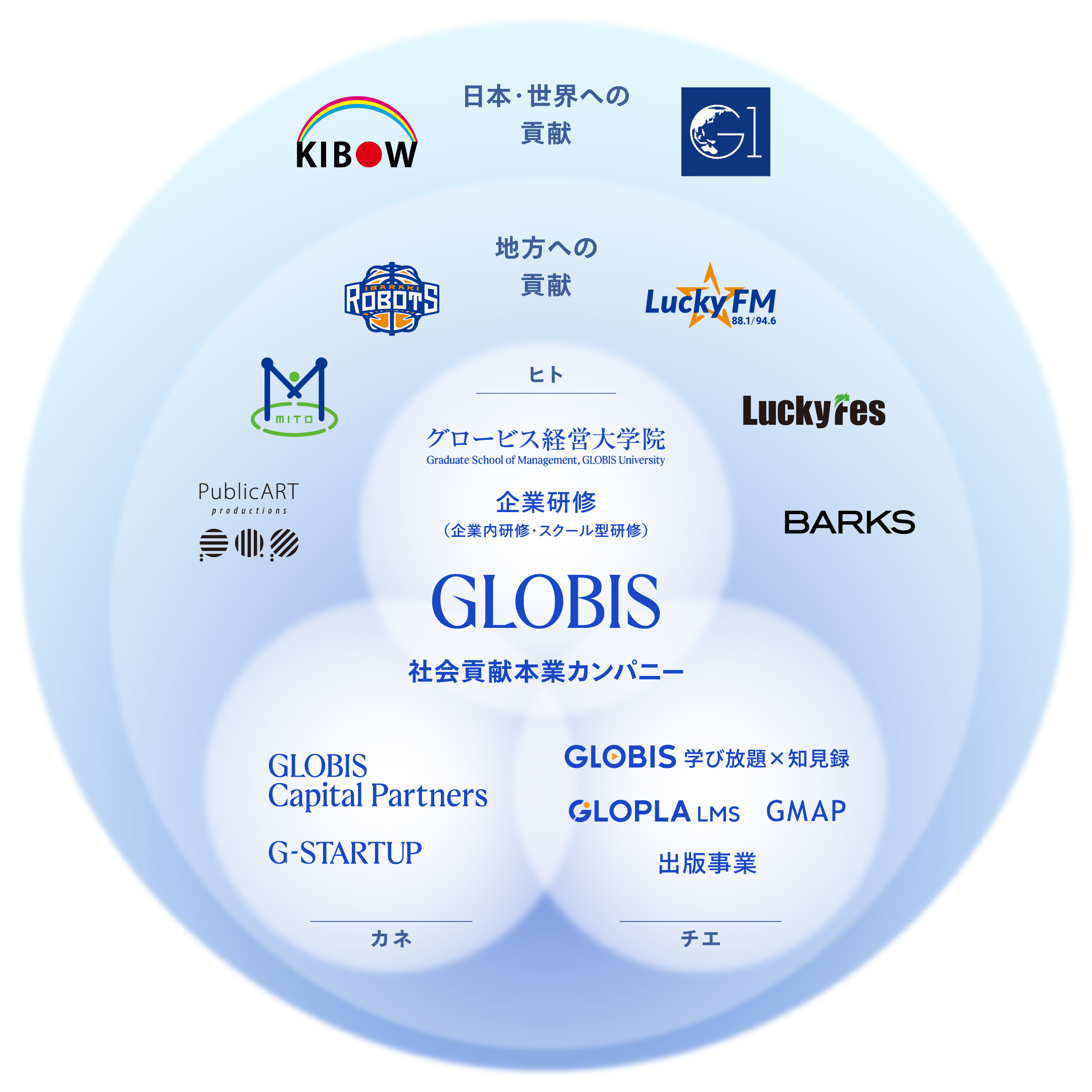 グロービスは1992年の設立以来、「経営に関するヒト・カネ・チエの生態系を創り、社会の創造と変革を行う」ことをビジョンに掲げ、各種事業を展開してまいりました。「ヒト」の面では、グロービス経営大学院に加え、スクール型研修や集合研修など法人向け人材育成サービスを展開するグロービス・コーポレート・エデュケーション、eラーニングや定額制動画学習サービス「GLOBIS 学び放題」などを提供するグロービス・デジタル・プラットフォームにより、リーダーの育成を推進しています。「カネ」の面では、ベンチャー企業への投資・育成を行うベンチャー・キャピタル「グロービス・キャピタル・パートナーズ」を運営、「チエ」の面では、出版事業ならびにオウンドメディア「GLOBIS 学び放題×知見録」を通じて知の発信を行っています。さらに社会における創造と変革を促進するため、一般社団法人G1によるカンファレンス運営、一般財団法人KIBOW による震災復興支援および社会的インパクト投資などの活動を展開しています。