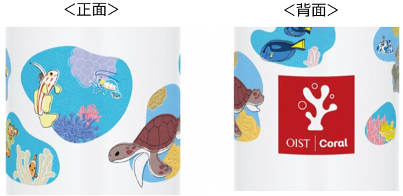 サンゴやウミガメなどのイラストが描かれ、海の中を表現したデザイン。ボトルの背面には「OIST サンゴプ ロジェクト」のロゴが入っています。