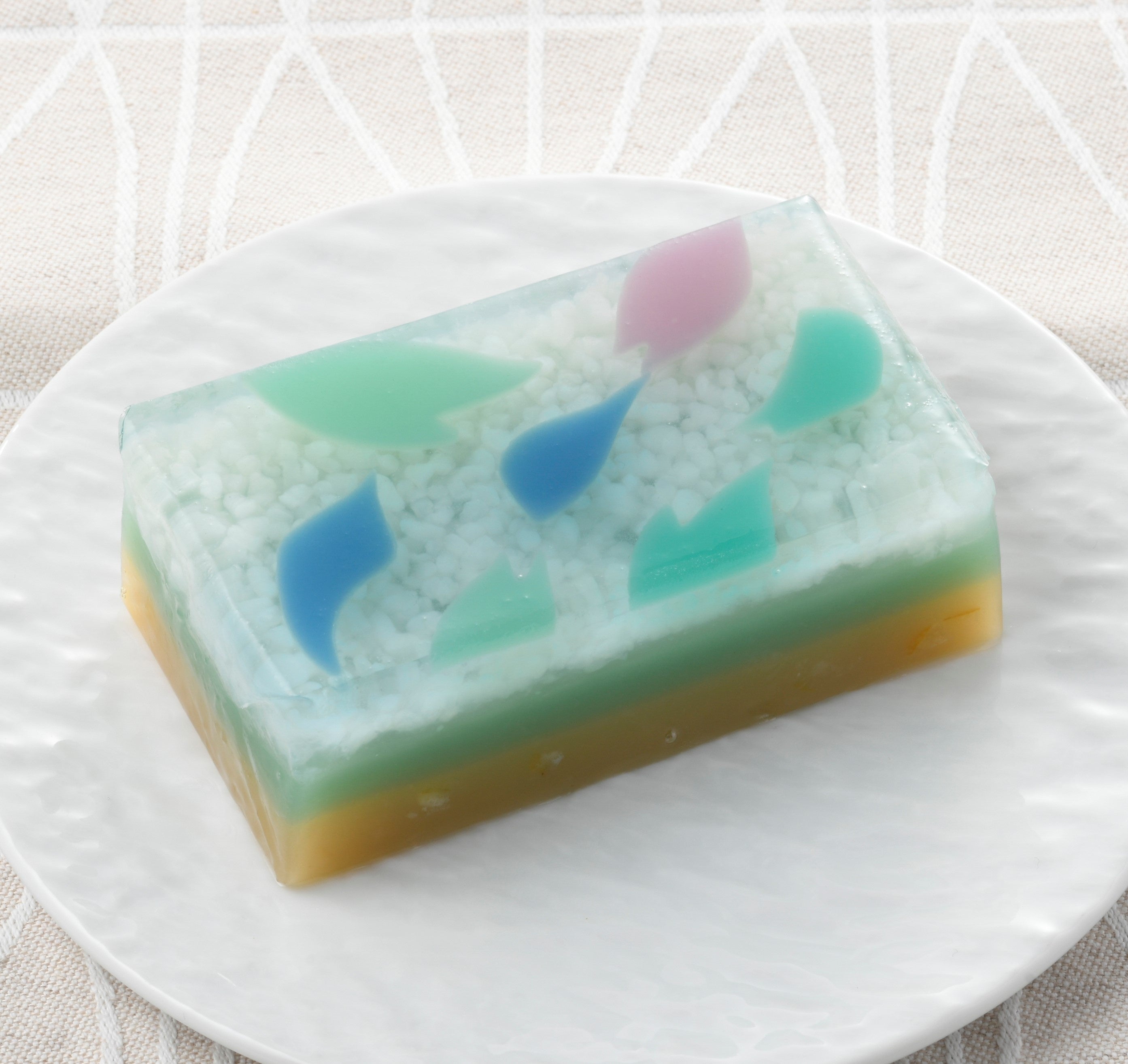 見た目にも美しい棹菓子を得意とする1634年創業の老舗和菓子店「両口屋是清」からは、昨秋初登場し10日間で100点が完売した人気商品が今年も登場します。寒天と砂糖を煮溶かし固めて作る錦玉羹で、京王百貨店の包装紙に描かれたハトを表現。羊羹に道明寺を重ね、刻んだレモンピールで食感にアクセントを加えています。