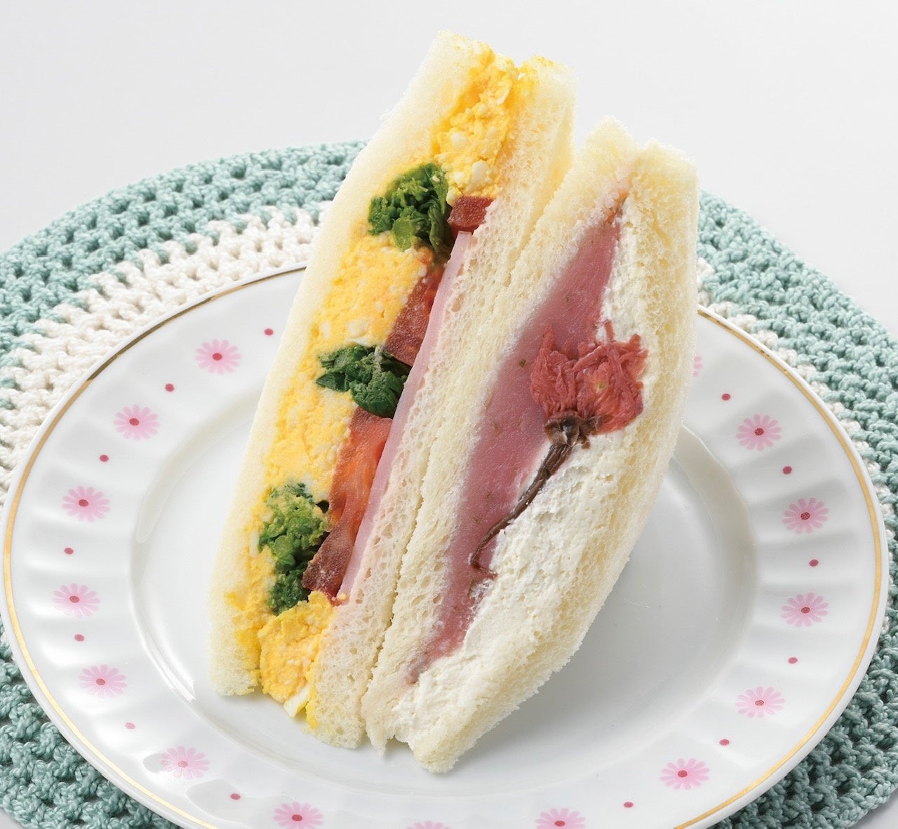 具材から丁寧に手作りするサンドイッチが種類豊富に並ぶサンドイッチ専門店。マヨネーズとあえてクリーミーに仕上げたタマゴサラダにハム・トマト・菜の花を合わせた惣菜系サンドと、桜餡・生クリームに桜の塩漬けを飾ったスイーツ系サンドをセットにしました。