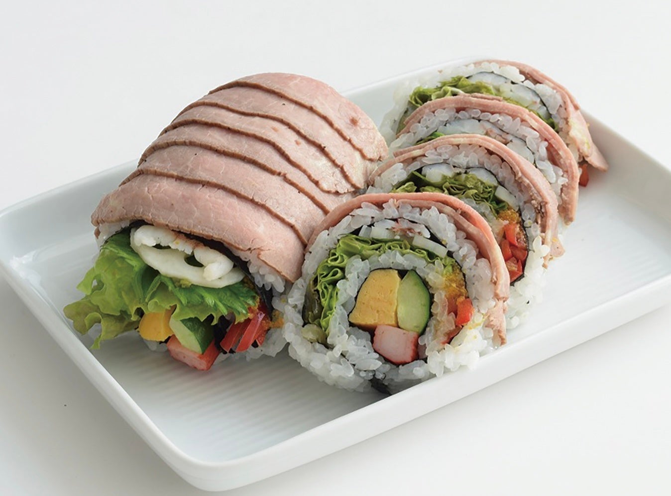 巻き寿司を中心とした老舗寿司店「古市庵」の看板商品で、エビやアナゴ、明太クラゲなど12種の具材を巻き込んだ「うず潮巻き」。常陸牛を低温で丁寧に調理し旨みを閉じ込めた、茨城県の駅弁調製元「しまだフーズ」の特製ローストビーフを贅沢に巻きました。