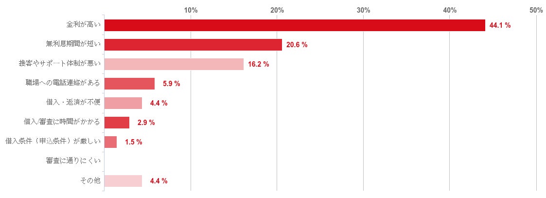一方、アコムの改善点には、「金利が高い」ことを挙げた人が44.1%で最も多く、「無利息期間が短い」ことを指摘した人も20.6%いた。