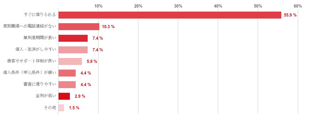アコムのメリットには、「すぐに借りられる」ことを挙げた人が圧倒的に多く、過半数を上回った。なお、そのほかには、「職場への電話連絡がない」「無利息期間が長い」「借入・返済がしやすい」などを挙げる人が多かった。