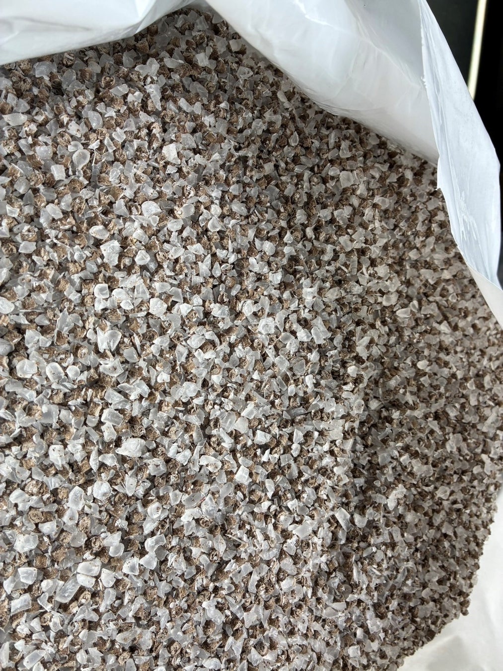 剪定枝はチップ化した後、パウダー状に加工します。プラスチック資源は粉砕してペレット状に加工します。加工した剪定枝のパウダーとプラスチック資源のペレットを混合し、射出成形することで、筒部分とキャップ部分を製造します。