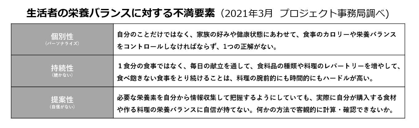 しかし生活者にとって栄養バランスを考えることは難易度が高く、義務・負担であると捉えられています。若年層でも、栄養バランスを意識してはいるものの、自分の行動が正しいのかという不安・不満を感じたり、健康であると自覚していることから具体的な行動を起こしていなかったりする生活者が多いことが明らかになっています(2021年3月 プロジェクト事務局調べ、下記参照)。