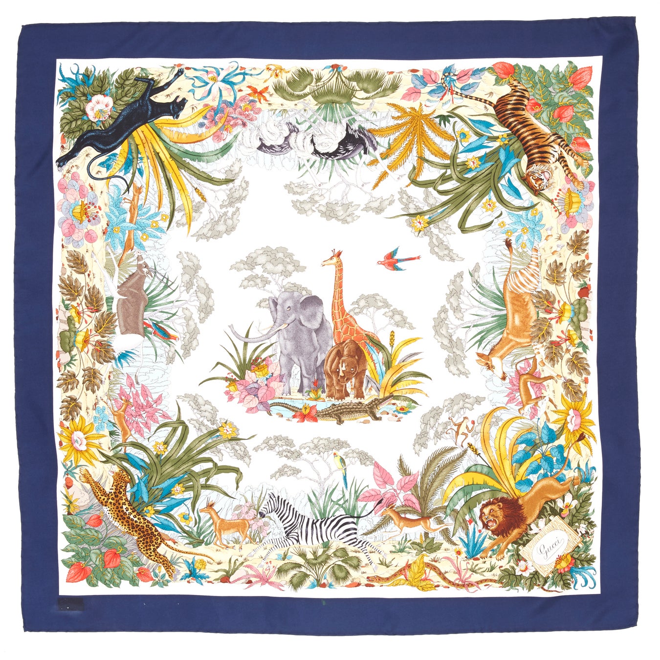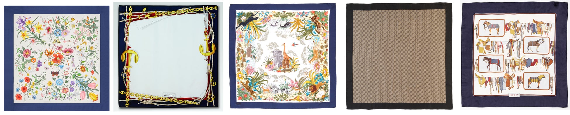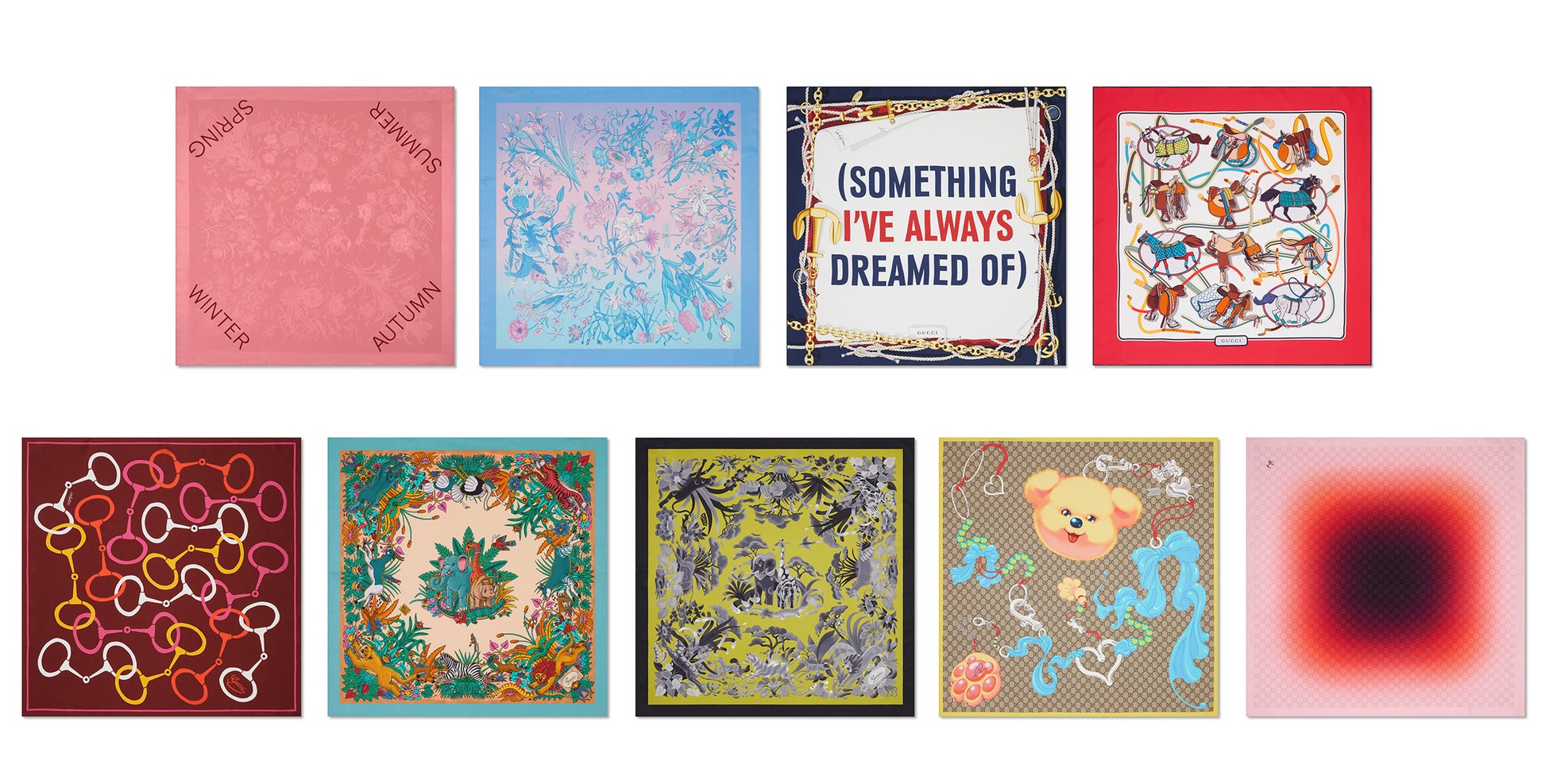 「これらのスカーフの中であらゆるモチーフが生き生きとしています。フローラの中心に咲くユリの花からサバンナの動物たちまで、すべてがSF的なモノトーンの輝きやアドベンチャーコミックの魅力的なキャラクターに変貌します。これらの表現は、グッチのアイコンをさらに強化し、新たな生命を吹き込んで、未来に向けた新たな視点、解釈、そして可能性を提示しています」― 『Gucci: The Art of Silk』より