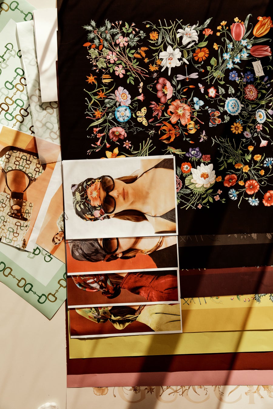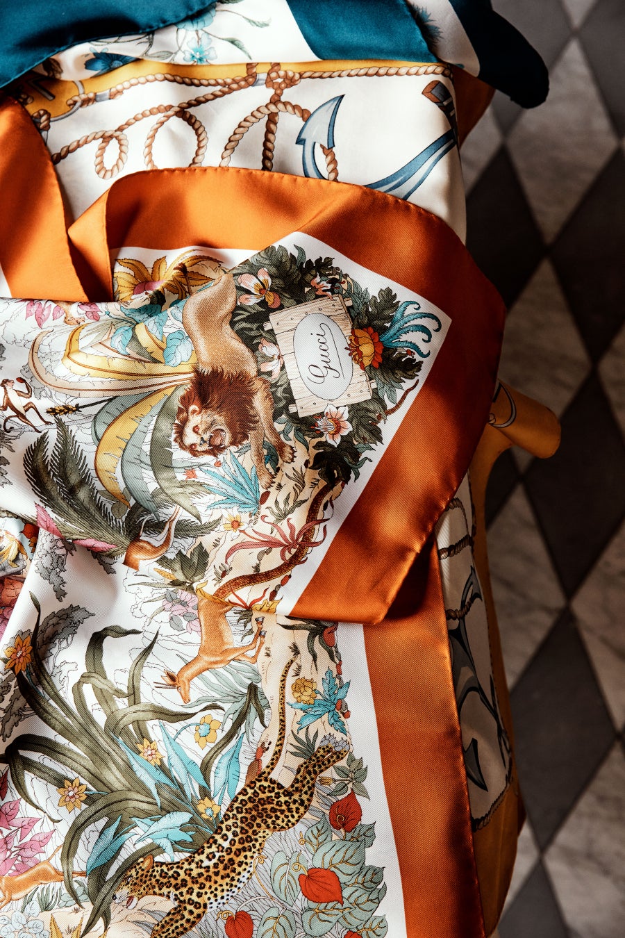 「ファッション アーカイブの探求とは、何よりもまず、観察と解釈を絶え間なく繰り返す作業です。スカーフのアーカイブの場合、それはまるで物語を読み解くようなものでもあります」 ― 『Gucci: The Art of Silk』より