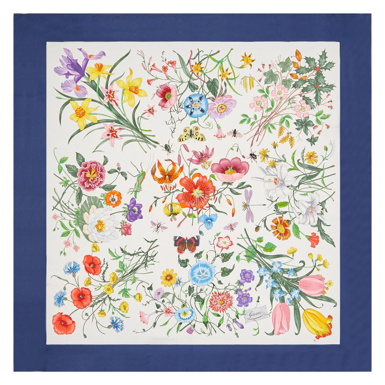 フローラ プリントのスカーフはグッチの最もアイコニックなアイテムのひとつで、そのオリジナルは、1966年にモナコのグレース大公妃のためにデザインされたものです。グレース大公妃に特別な贈り物をしたいというロドルフォ・グッチの想いを受けて、ヴィットリオ・アッコルネロ・デ・テスタは緻密なデザインの傑作をわずか1週間で完成させました。