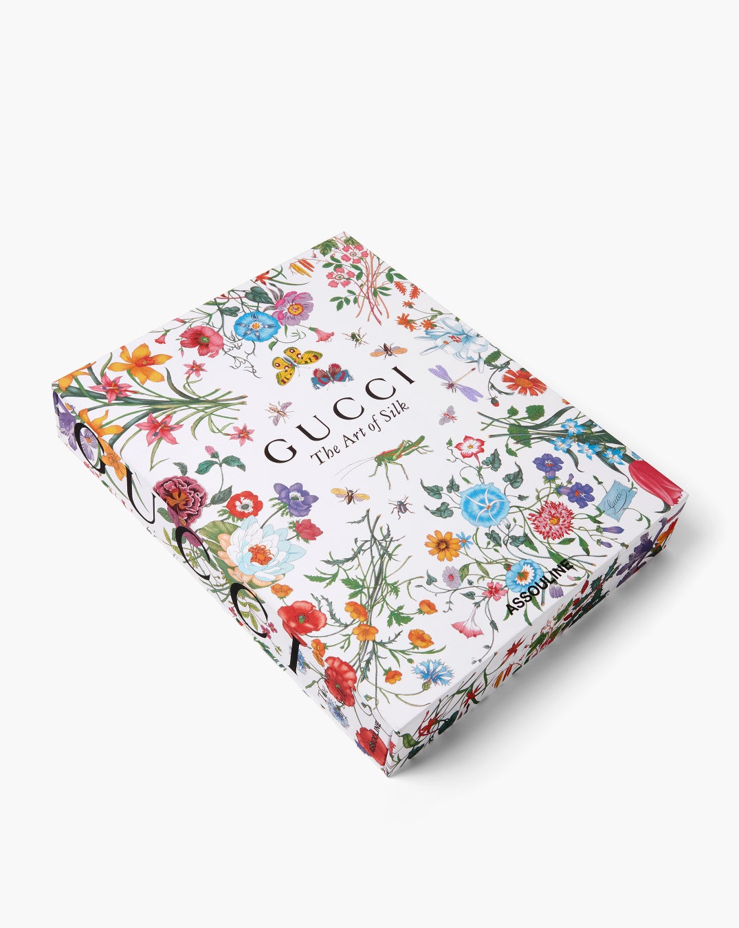 『Gucci: The Art of Silk』は、美しいシルクプリントのケースに箔押しのロゴが施され、コレクターにとって真のマスターピースとなるでしょう。また、28 x 35cmサイズの本書は300ページにわたるボリュームとなっており、表紙には、グッチの最も有名なモチーフのひとつである「フローラ プリント」があしらわれています。ボッティチェリの絵画《プリマヴェーラ(春)》を思わせるこの美しいプリントは、37色を使い、43種類の花や植物、昆虫をすべて手描きで描いたものです。