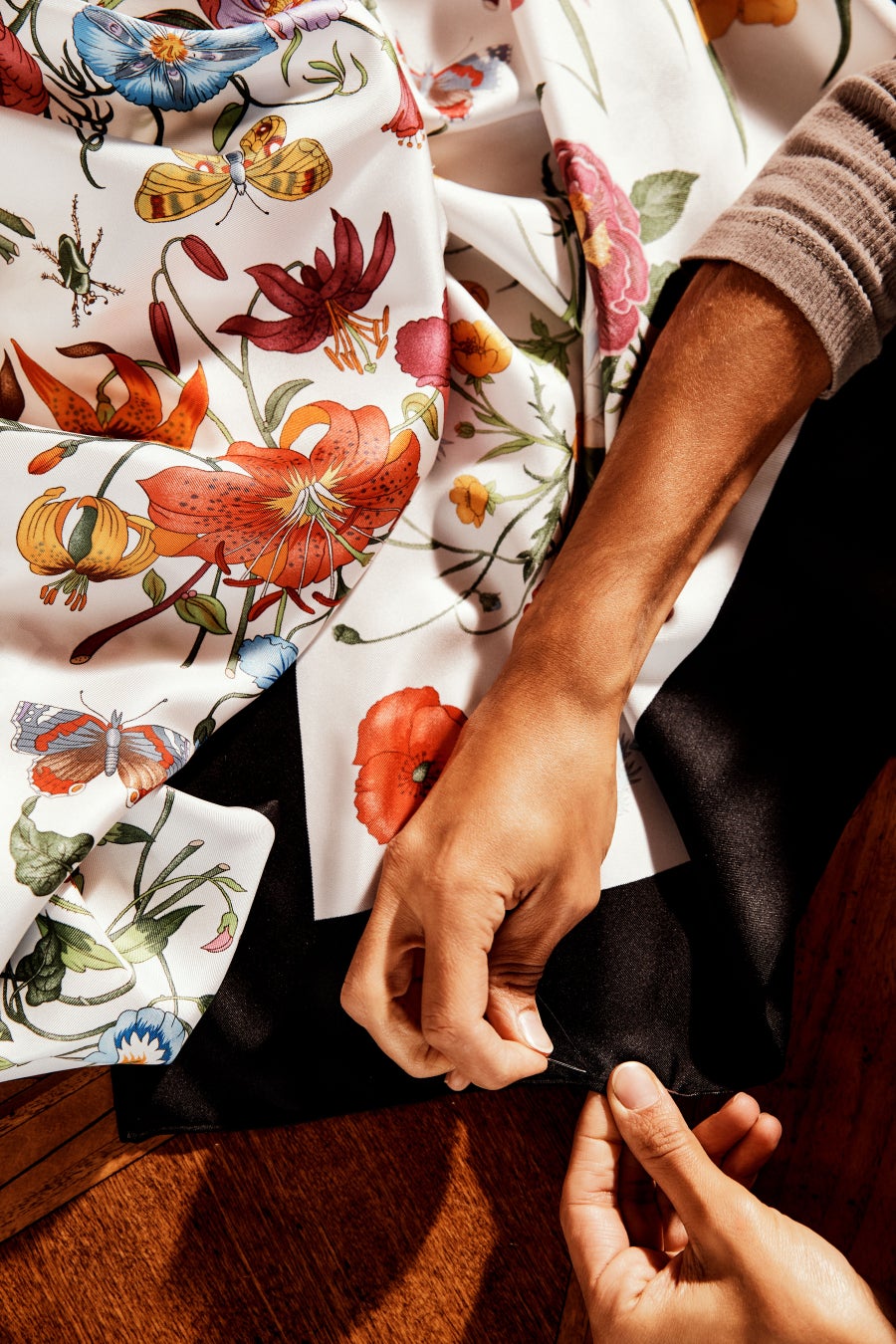 27種類の花々とともに、木の実や蝶、昆虫が繊細なタッチで描かれたそのデザインをシルクに再現するために、37色もの異なる色を使い、一つひとつの色を慎重に重ねていくという方法でプリントが施されました。その鮮やかな美しさはシルク製品におけるグッチの卓越した職人技の証です。フローラ プリントは瞬く間に人気となり、1969年にはグッチ初のシルクドレスの誕生へとつながりました。その後もフローラは、グッチの歴代クリエイティブ・ディレクターたちのそれぞれのヴィジョンが注ぎ込まれ再解釈されながら、時代を超えた魅力を保ち続けています。