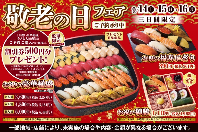 また、嬉しい特典として『お祝い豪華桶盛』または定番大皿商品をご予約・ご購入いただくと、大皿1商品につき、敬老の日フェア後にご利用できる「割引券500円分」を進呈いたします。