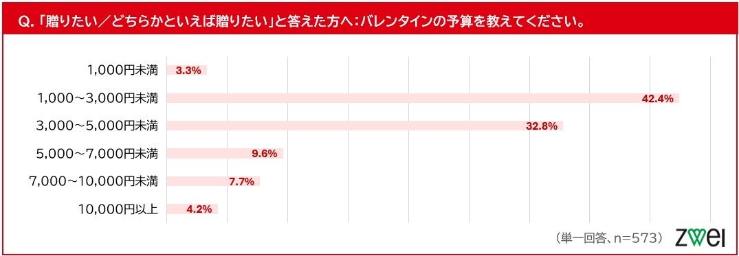 バレンタインのプレゼントの予算について尋ねたところ、「1,000~3,000円未満」が42.4%で最多となり、次いで「3,000~5,000円未満」が32.8%となりました。全体の約75%が5,000円未満と回答しており、無理のない範囲で気持ちとして贈るパターンが多数を占めることがうかがえます。一方で、「5,000~7,000円未満」は9.6%、「7,000~10,000円未満」は7.7%、「10,000円以上」は4.2%と、高額予算は、一部に限られる結果となりました。