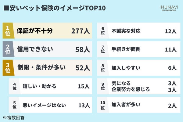 ・保険料の安いペット保険のイメージは「補償が不十分」「信用できない」で、「本当に必要な時に支払ってくれるのか疑問」「数年でサービスや会社がなくなるのではないか」といったコメントも多く見られる。