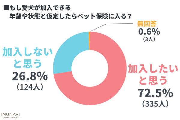 もし愛犬が加入できる年齢や状態だったらペット保険に入る?という質問では、「加入したいと思う」と回答した飼い主さんは72.5%でした。