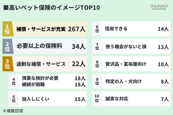 ・保険料が高いペット保険のイメージは「補償が充実」「富裕層向け」で、「高すぎても信頼性に欠ける」「保険料を払い続けるのが厳しそう」といったコメントもあった。