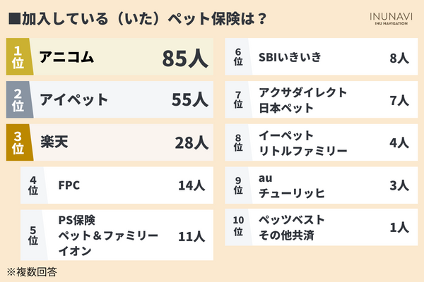 加入している(いた)ペット保険で最も多かったのは「アニコム」85人でした。