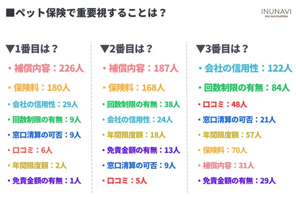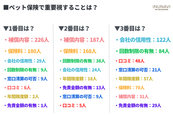 ペット保険で重要視することは1位「補償内容」2位「保険料」3位「会社の信用性」という結果に