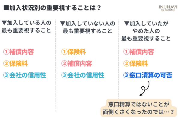 現在加入している飼い主さんでは最も重要視することに「補償内容」が多く集まりましたが、加入していない飼い主さんでは「保険料」が挙がるなど、加入していない飼い主さんは保険料がネックになっているということがうかがえます。