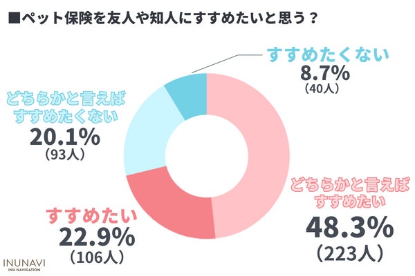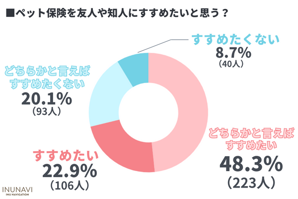 ペット保険を友人や知人にすすめたいと思うかとの質問で、最も多い回答は「どちらかと言えばすすめたい」48.3%でした。