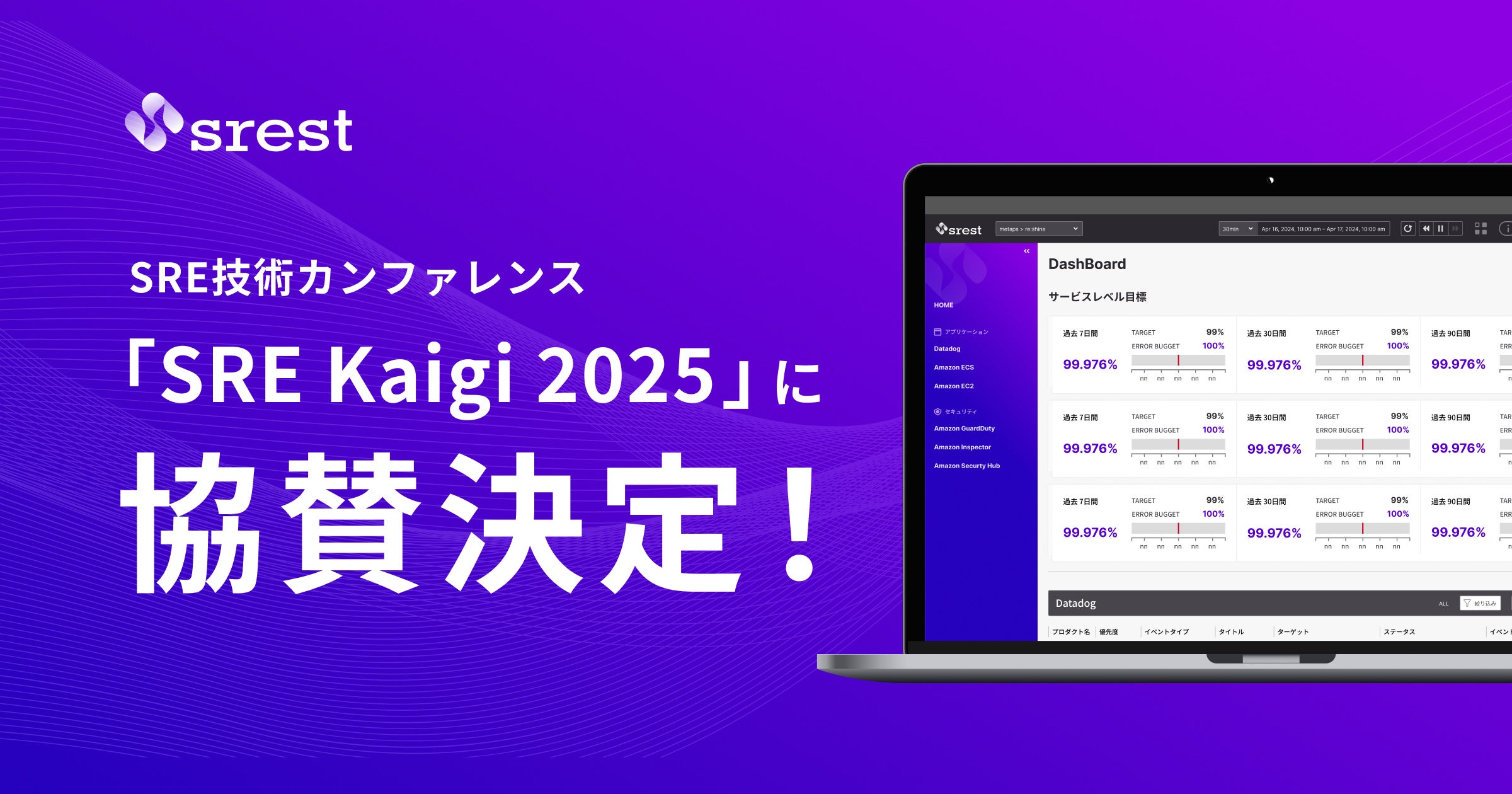 株式会社メタップスホールディングス(渋谷区、代表取締役社長 山﨑 祐一郎)が提供するAWS横断監視ツール「srest(スレスト)」は、2025年1月26日(日)に中野セントラルパークで開催される「SRE Kaigi 2025」にPLATINUM スポンサーとして協賛します。当日は、ブース出展、スピーカーとして登壇をします。本イベントの協賛をはじめ、今後もSREの普及、活用拡大に向けて取り組んでいきます。