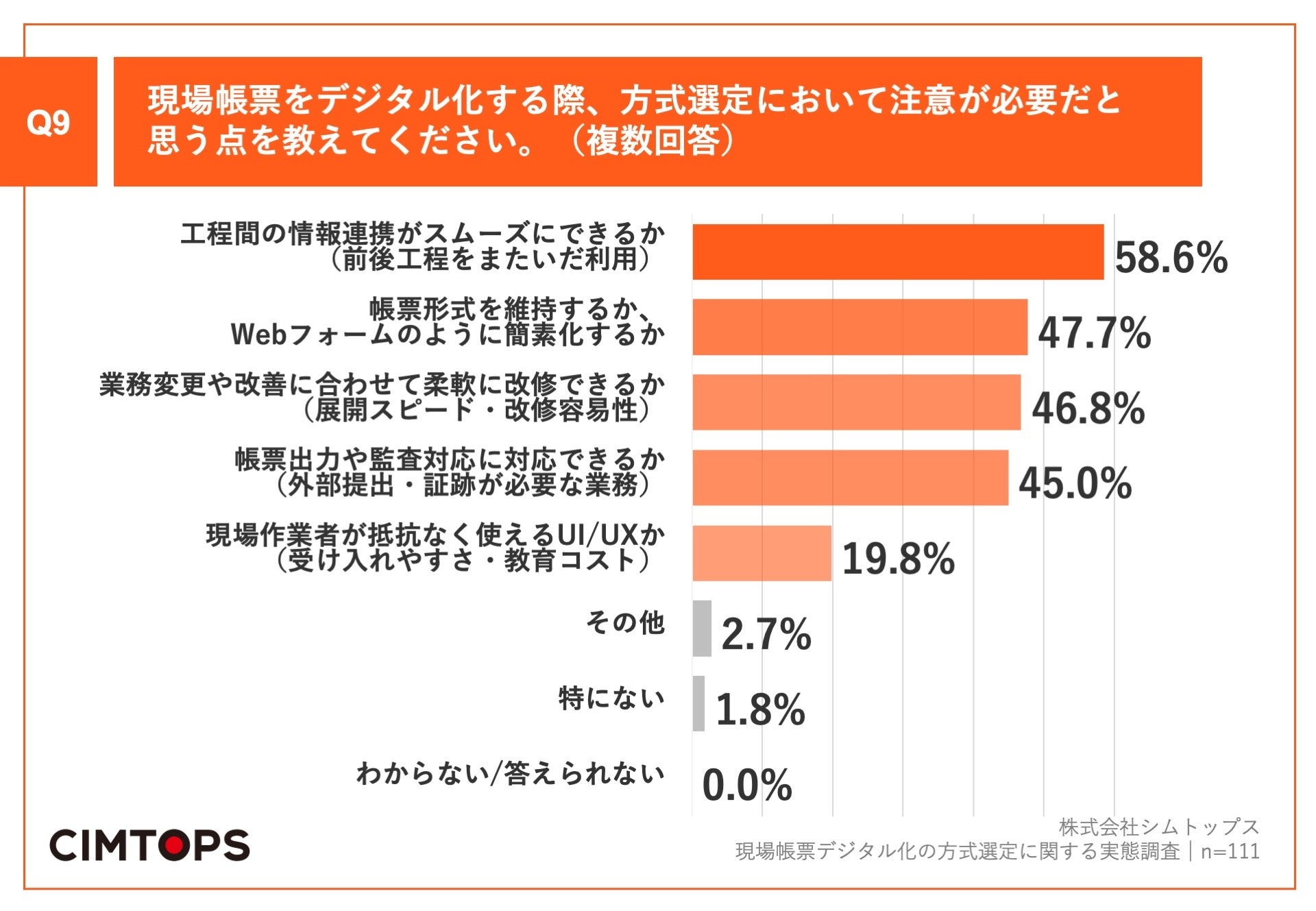 「Q9.現場帳票をデジタル化する際、方式選定において注意が必要だと思う点を教えてください。(複数回答)」(n=111)と質問したところ、「工程間の情報連携がスムーズにできるか(前後工程をまたいだ利用)」が58.6%、「帳票形式を維持するか、Webフォームのように簡素化するか」が47.7%、「業務変更や改善に合わせて柔軟に改修できるか(展開スピード・改修容易性)」が46.8%という回答となりました。