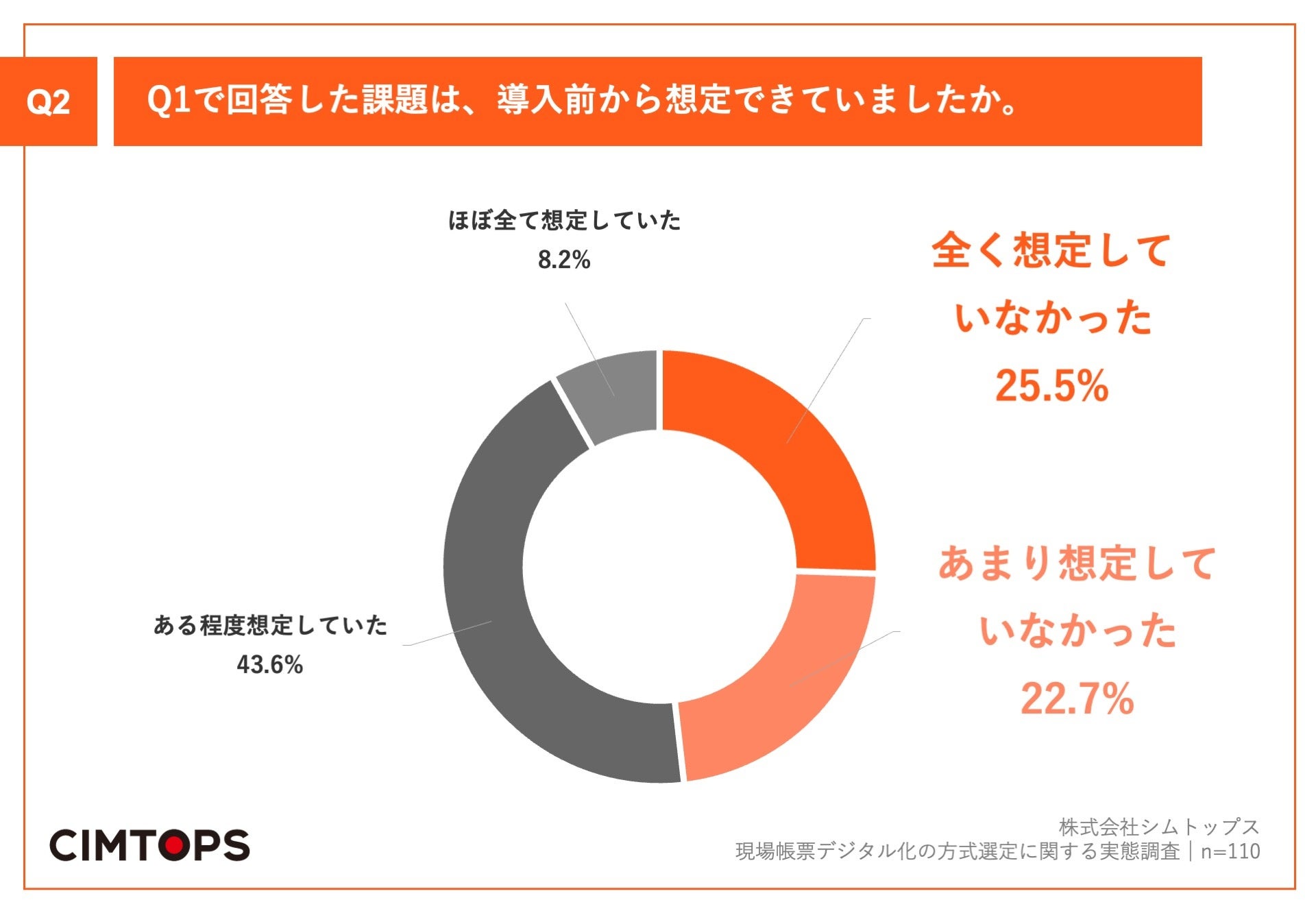 Q1で「特にない」「わからない/答えられない」以外を回答した方に、「Q2.Q1で回答した課題は、導入前から想定できていましたか。」(n=110)と質問したところ、「全く想定していなかった」が25.5%、「あまり想定していなかった」が22.7%という回答となりました。