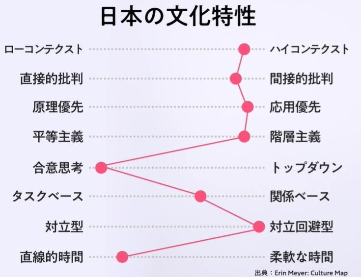 カルチャーマップにより日本人の文化特性を紐解いていくと、以下のような特徴が見えてきます。