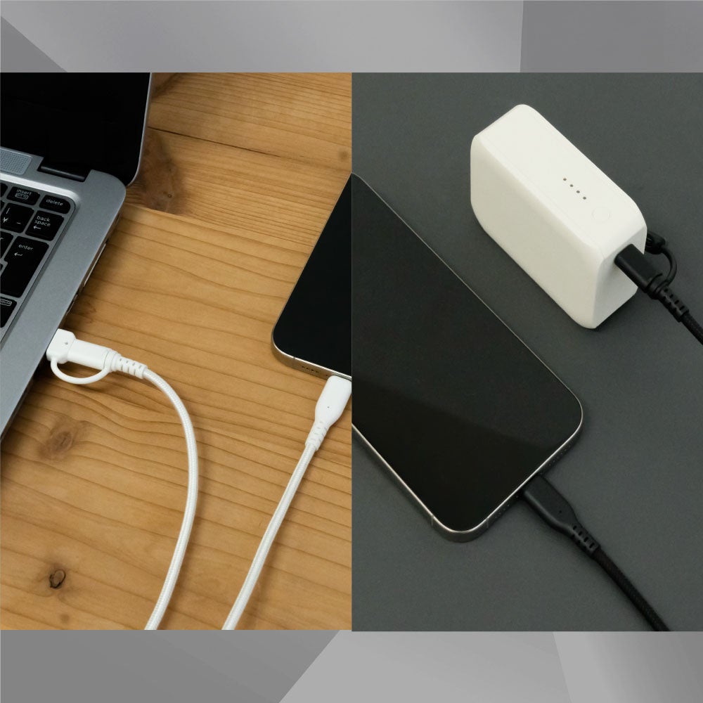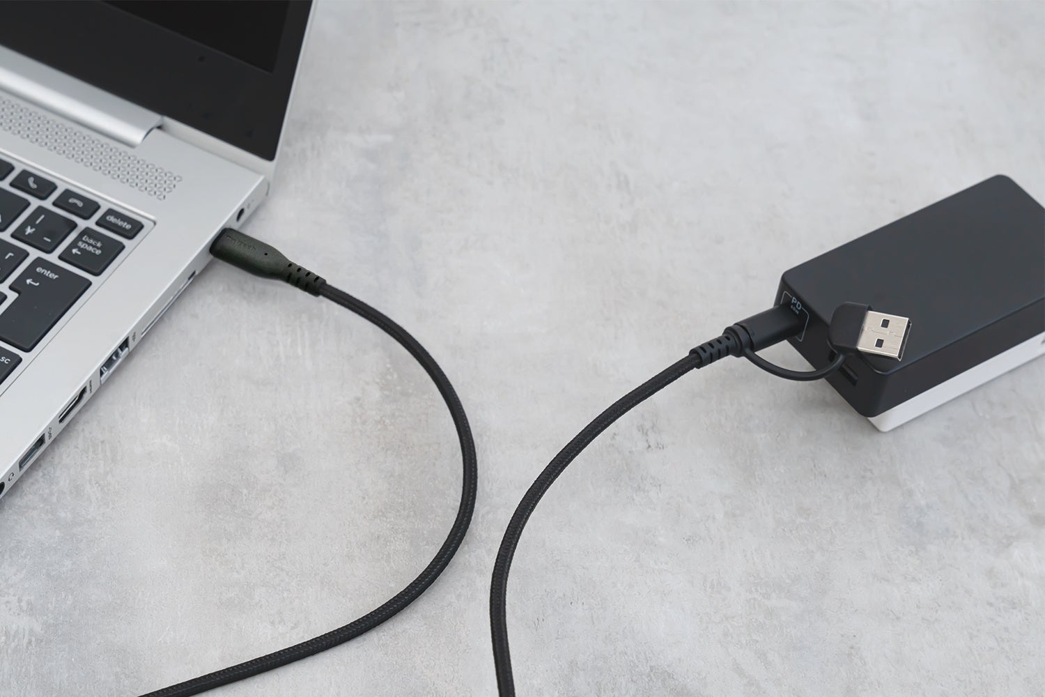 本製品はUSB Type-Aポート搭載機器またはUSB Type-Cポート搭載機器で使える2 in 1ケーブルです。通常時はUSB Type-C to Type-Cケーブルとして、USB Type-A変換アダプターを装着すれば、USB Type-A to Type-Cケーブルとしてお使いいただけます。