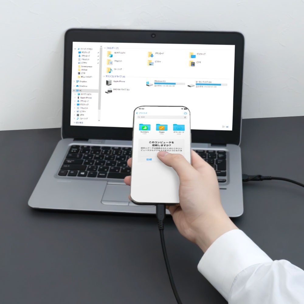データ転送に対応しているので、スマートフォンからノートPCに写真や動画などを移動できます。