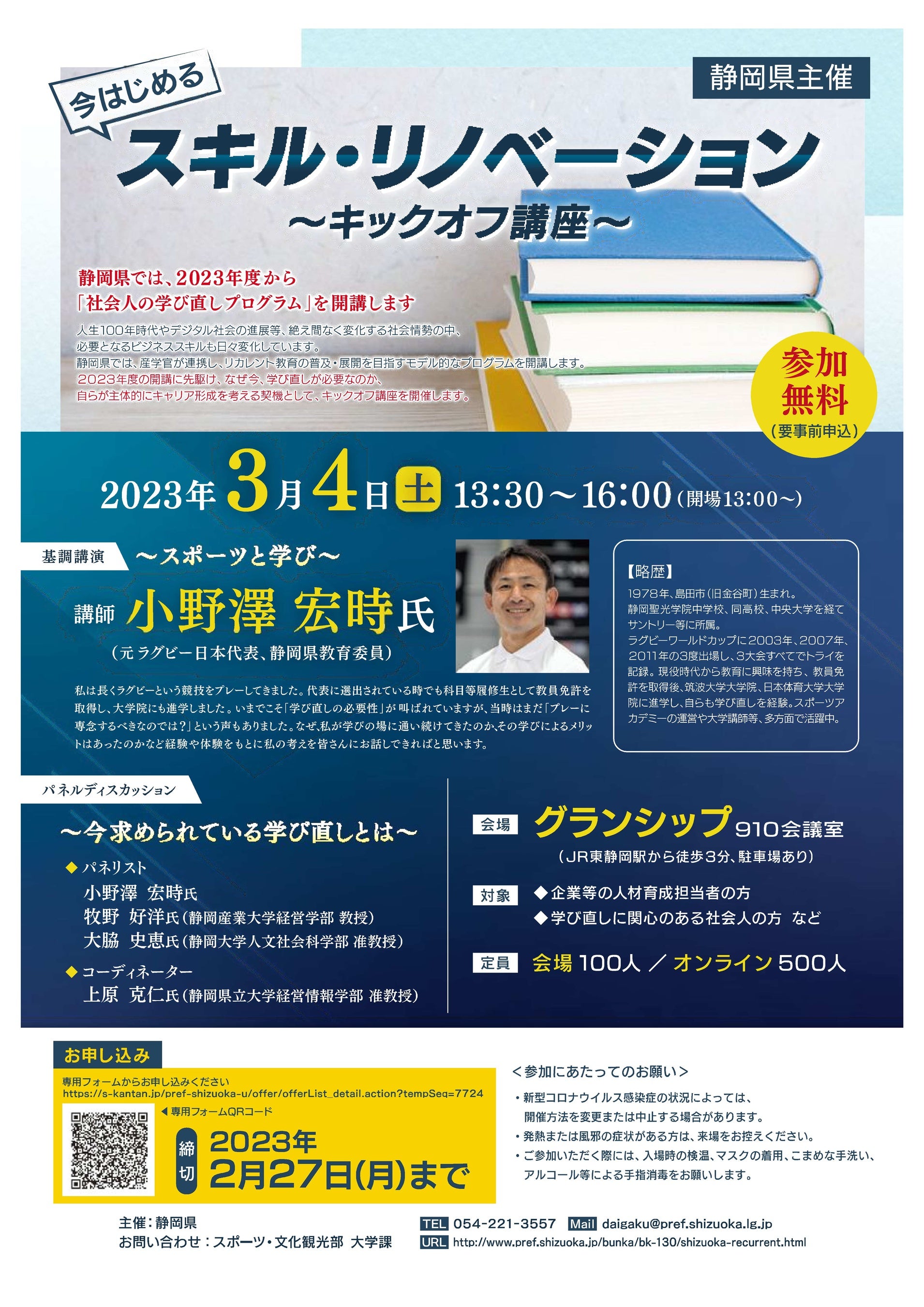 静岡県では、令和5年度から学び直しのためのモデル講座を開始する予定であり、今回、企業及び県民の皆様の機運醸成を図るため、「今はじめる スキル・リノベーション~キックオフ講座~」を開催します。