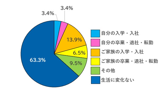 「自分の入学・入社」と「自分の卒業・退社・転勤」と回答した方を合わせても、その半分にも満たないので、ご自分の生活の変化よりも、ご家族の生活が変化したという方がとても多いようです。