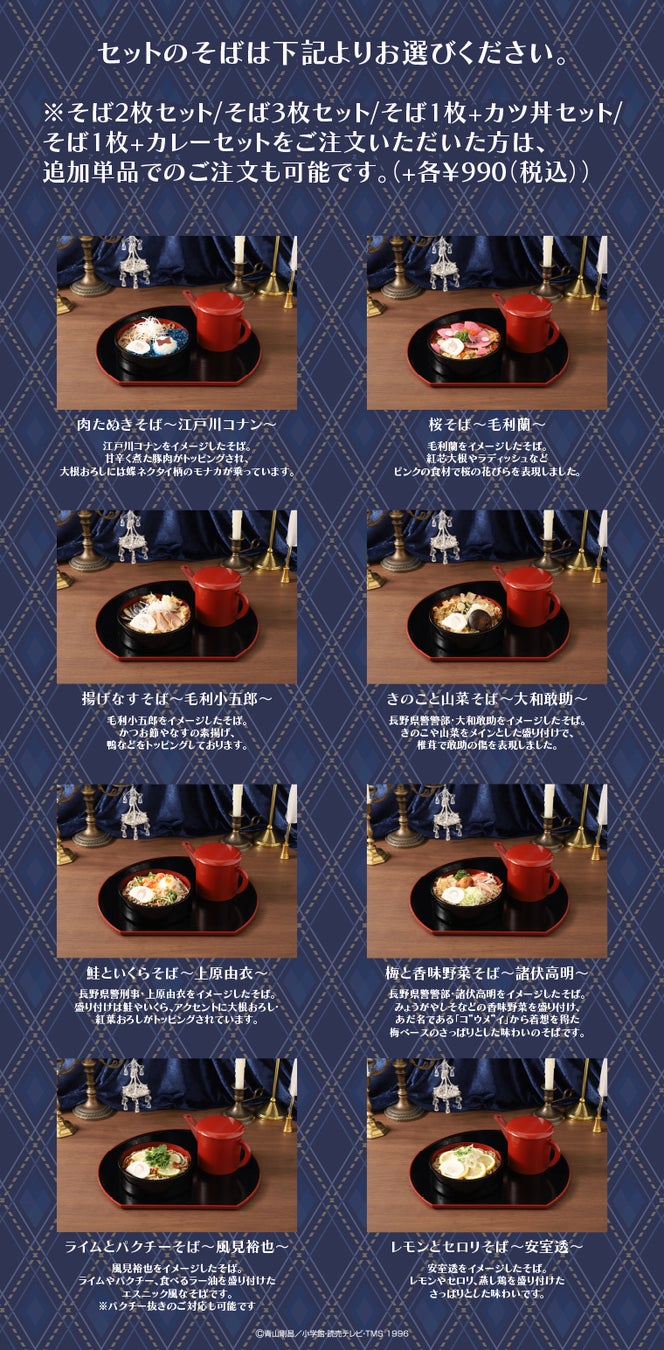 各キャラクターをイメージした創作そばと、出汁が効いたミニカレーのセット。