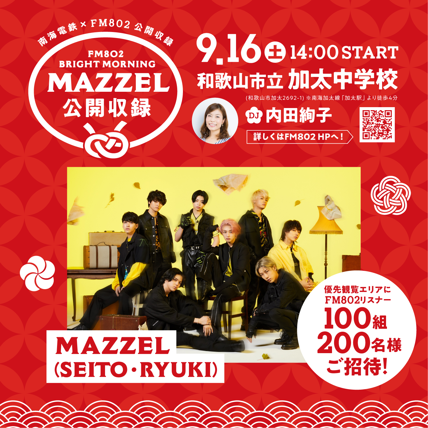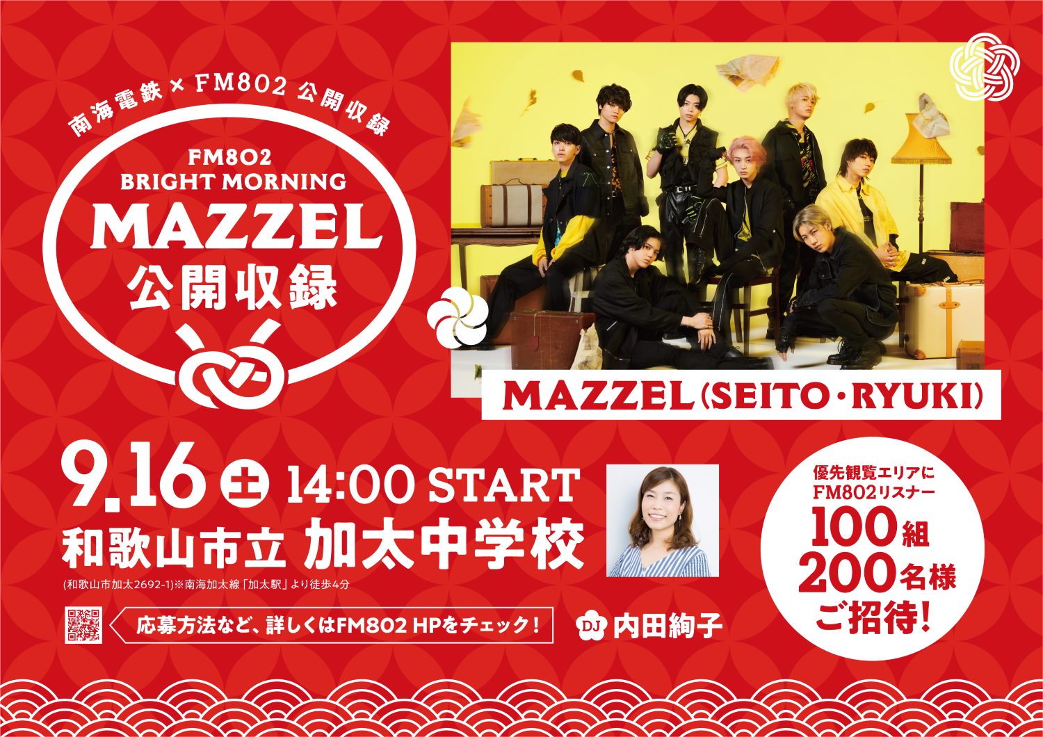 この番組の公開収録の開催が決定。ゲストにBMSGが打ち出す新世代ダンス&ボーカルグループ、MAZZEL(マーゼル)のSEITOとRYUKIが登場します!このイベントの優先観覧エリアにFM802リスナー100組200名様をご招待します。