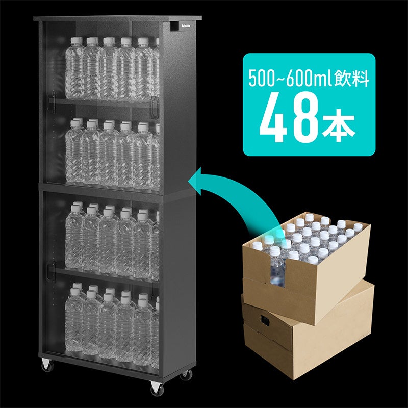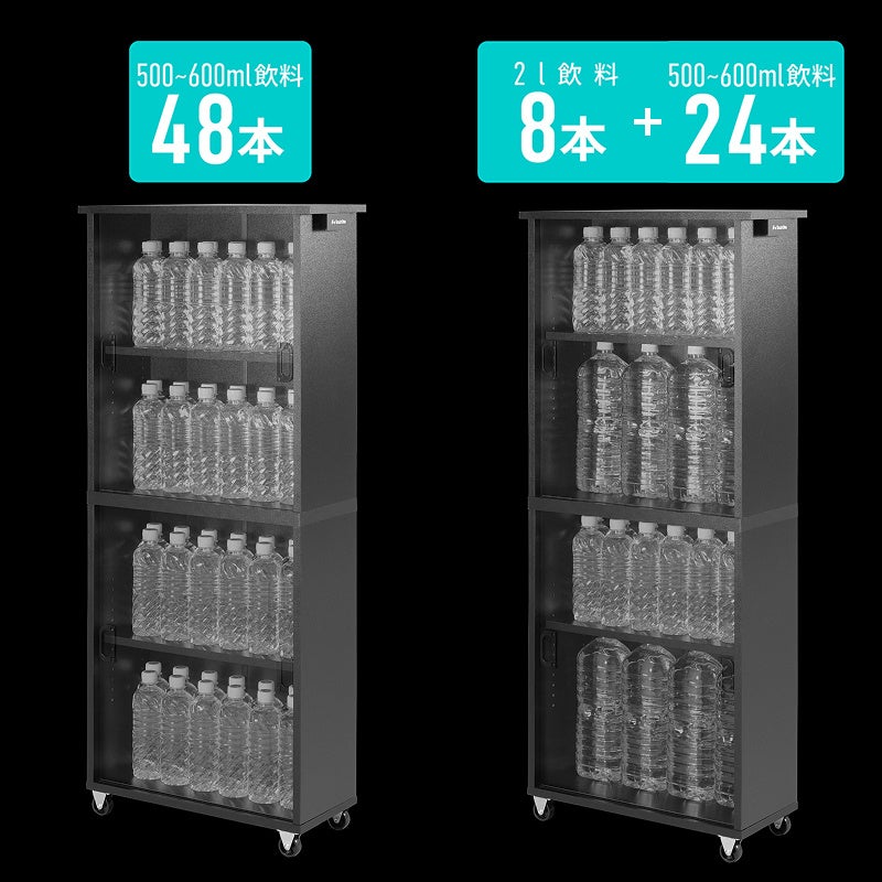 幅20cmの非常にスリムな設計でありながら、箱買いに対応できる大容量の収納力。冷蔵庫横のわずかなデッドスペースに、飲料2ケース分に相当するストックを効率よく格納することが可能です。500~600ml飲料であれば最大48本(約1~2箱分)に対応し、2L飲料×8本と500~600ml飲料×24本で組み合わせて収納することも可能です。重い飲料を段ボールのまま床に置く必要がなくなり、収納効率と衛生面を向上させます。