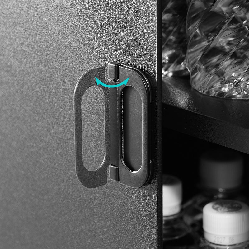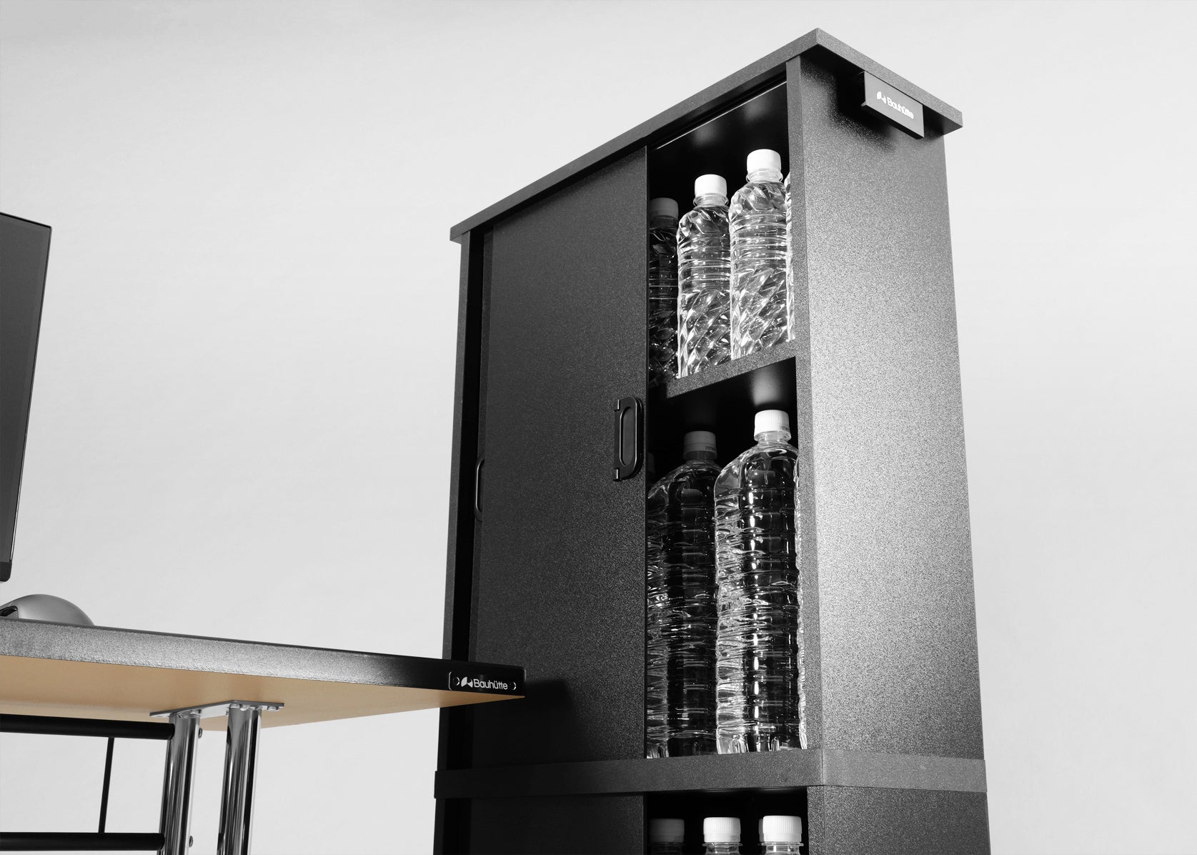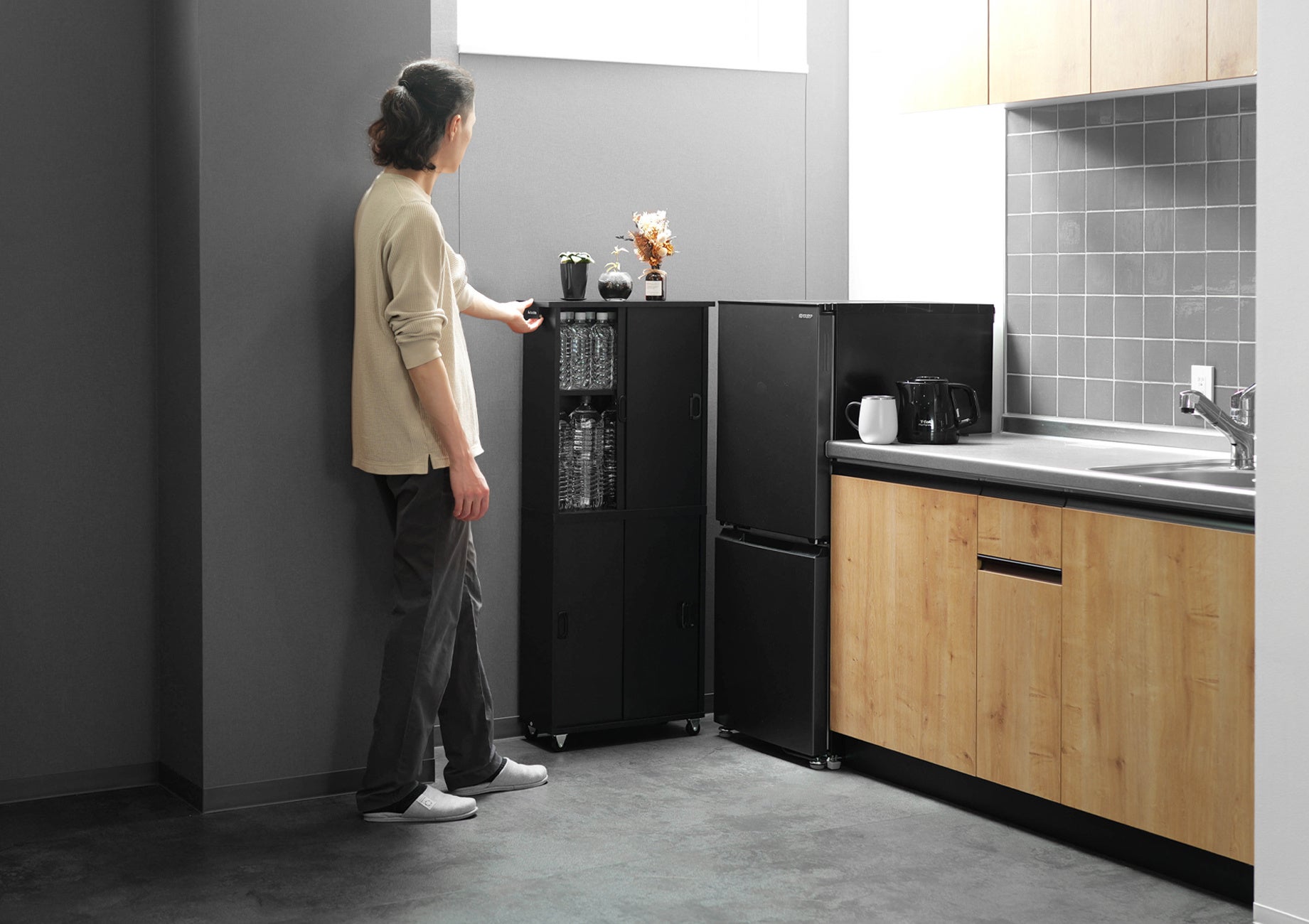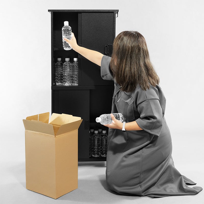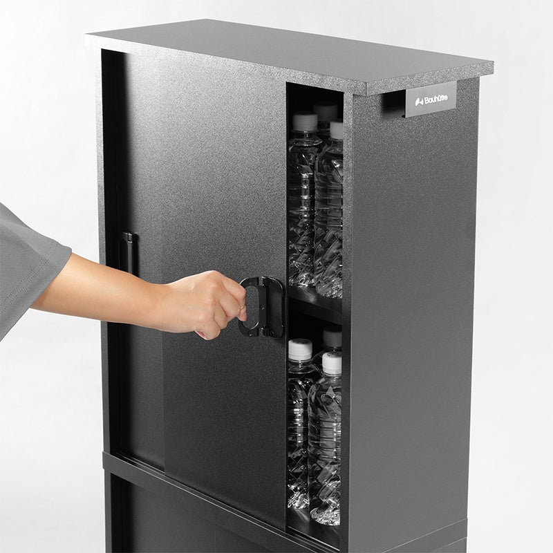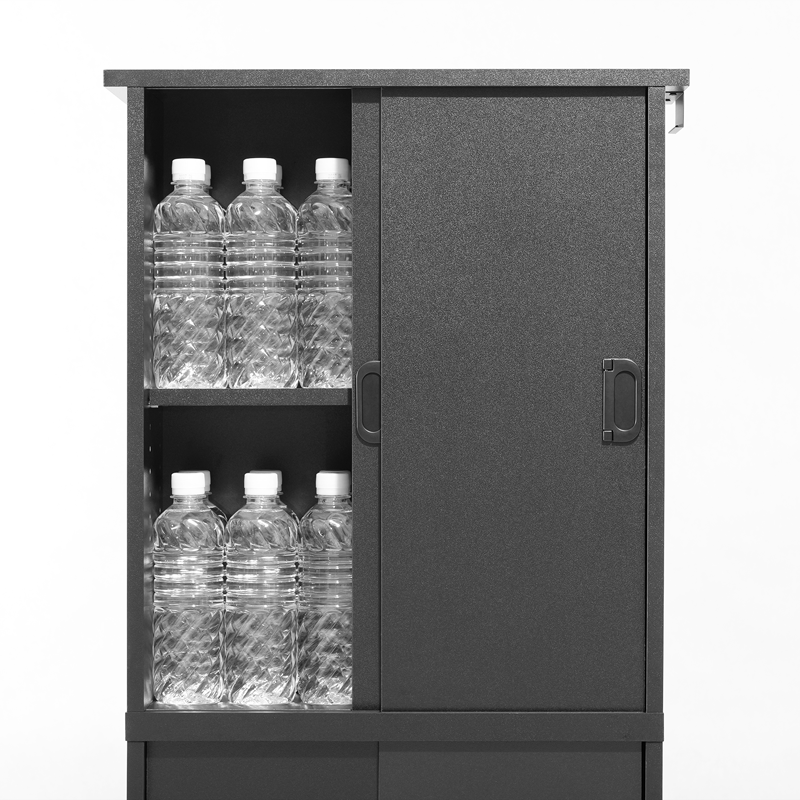 前面にスライド式ドアを設けたフルクローズ設計で、視界・外部環境から収納物を隔離。大量のペットボトルから溢れ出る生活感を隠蔽しつつ、ホコリや直射日光からしっかりとガードします。長期保管になりがちな飲料も、外部要因からの品質劣化を防いで保管できます。