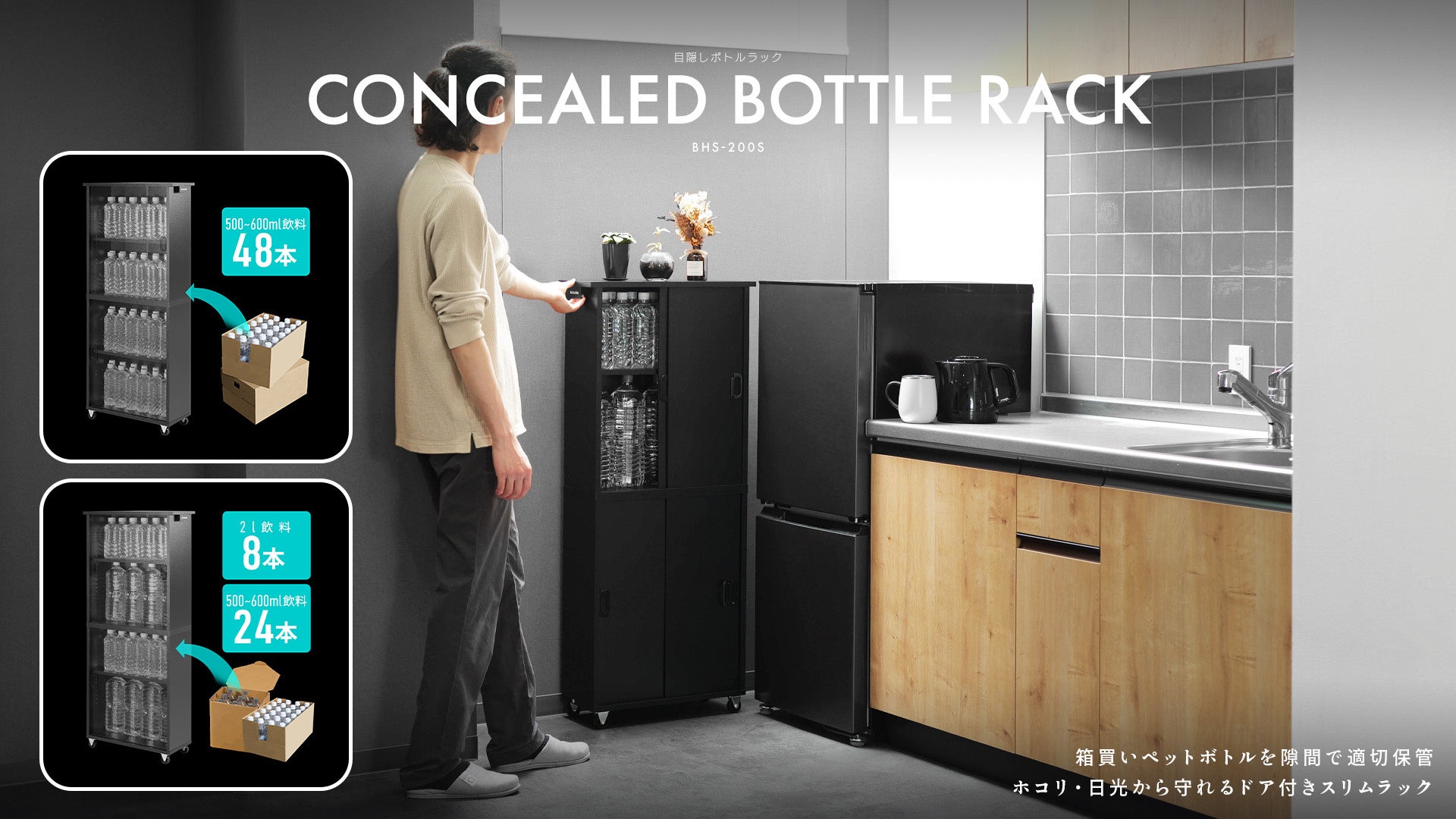 弊社ゲーミング家具ブランド「Bauhutte(R)(バウヒュッテ)」は2025年11月、冷蔵庫横などのデッドスペースを活用し、箱買い飲料や備蓄品を"隠して"収納できる「目隠しボトルラック BHS-200S」を発売いたします。