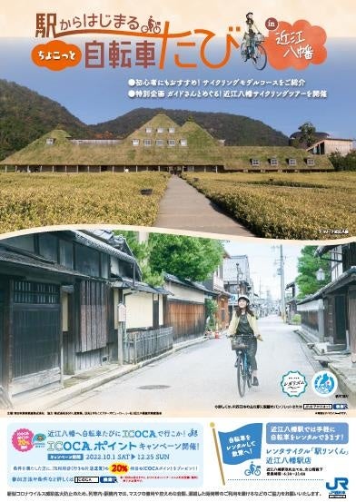 滋賀県近江八幡エリアにて、駅からレンタサイクルに乗って町めぐりを楽しんでいただけるサイクリングのモデルコースを紹介する「駅からはじまる ちょこっと自転車たびin近江八幡」についてお知らせいたします。期間中は、ガイドと一緒にサイクリングで巡る特別ツアーやICOCAポイントキャンペーンを開催いたします。この秋は、駅からサイクリングを活用し、開放的な屋外で近郊の自然や今まで知らなかった町の魅力を楽しんでみませんか。