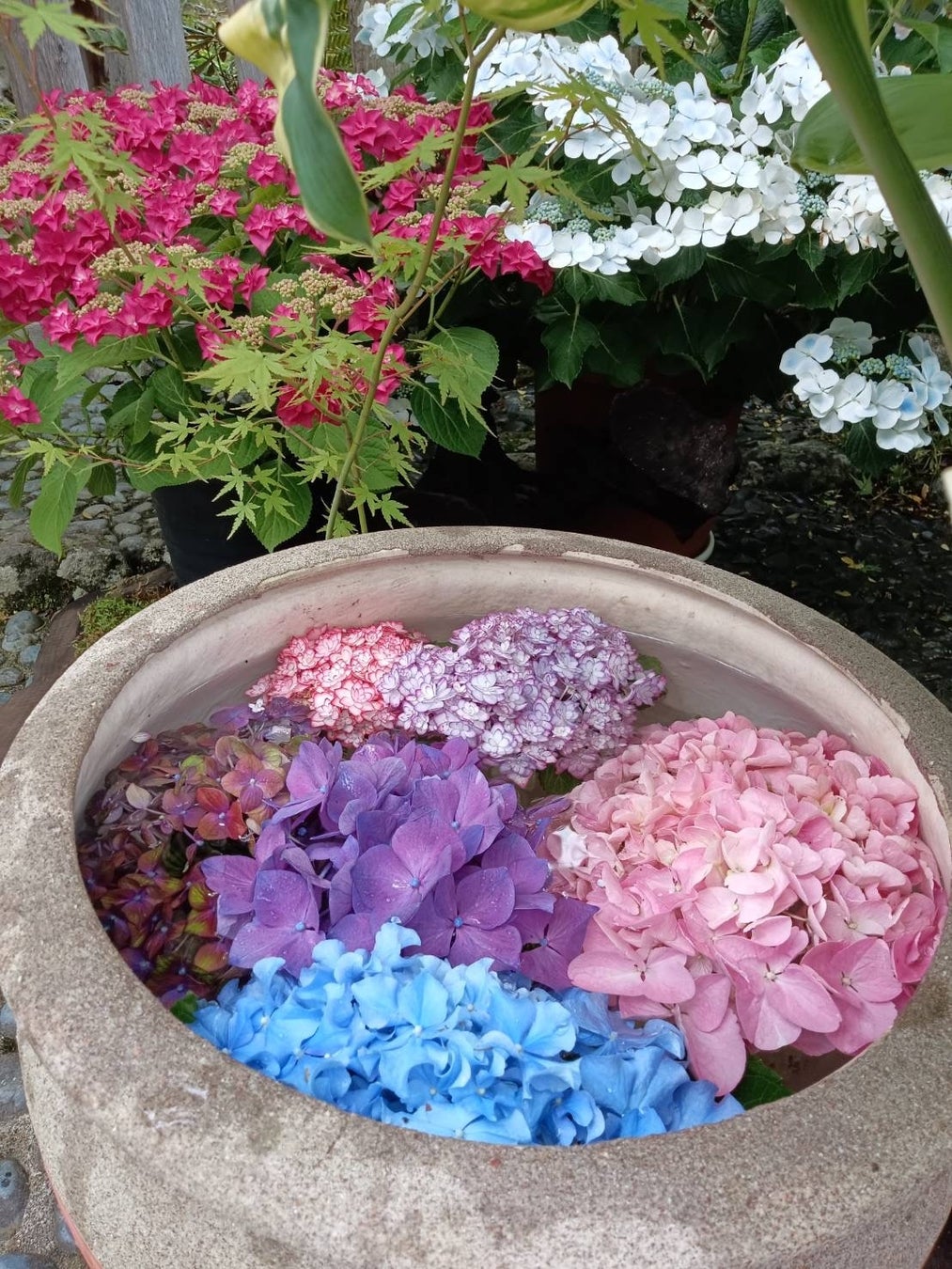 箱根の風物詩「あじさい電車」の終着駅「強羅駅」から徒歩約5分の箱根強羅公園では、6月30日まで、111鉢のあじさいがフォトスポットとしてお客さまをお迎えしています。園内にある白雲洞茶苑から噴水池へ続く階段に、華やかで優雅な「ダンスパーティ」など約29種類のあじさいの鉢を並べ、あじさいに囲まれて撮影することができます。また、白雲洞茶苑の入口には、色とりどりのあじさいを浮かべた花手水をお楽しみいただけます。