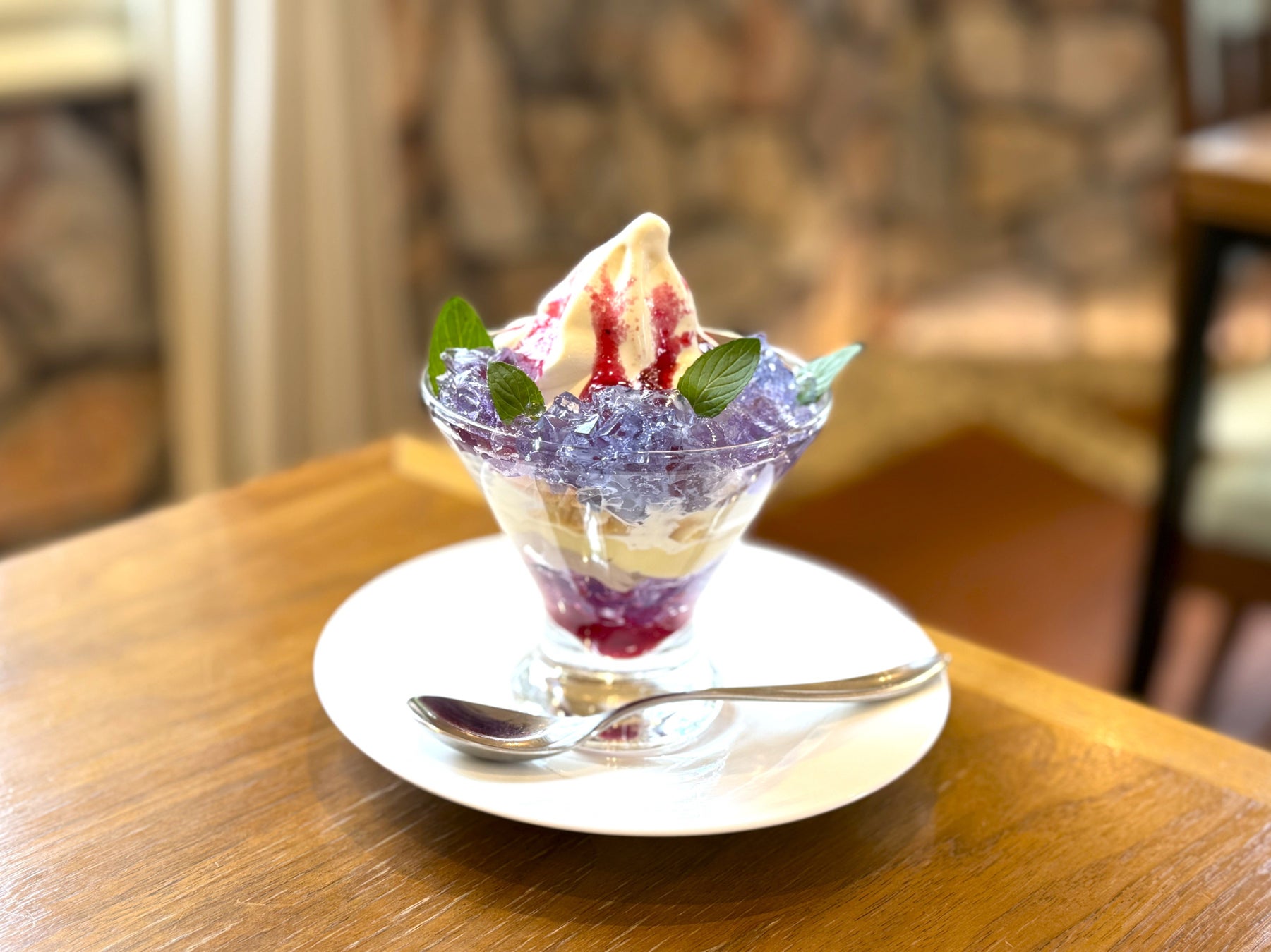 あじさいに見立てたバタフライピーティーのゼリーの下には、ひっそりと忍ばせたチョコケーキやベリーソースなど、見た目からは想像できないひと口ごとに変わる味わいをお楽しみいただけます。