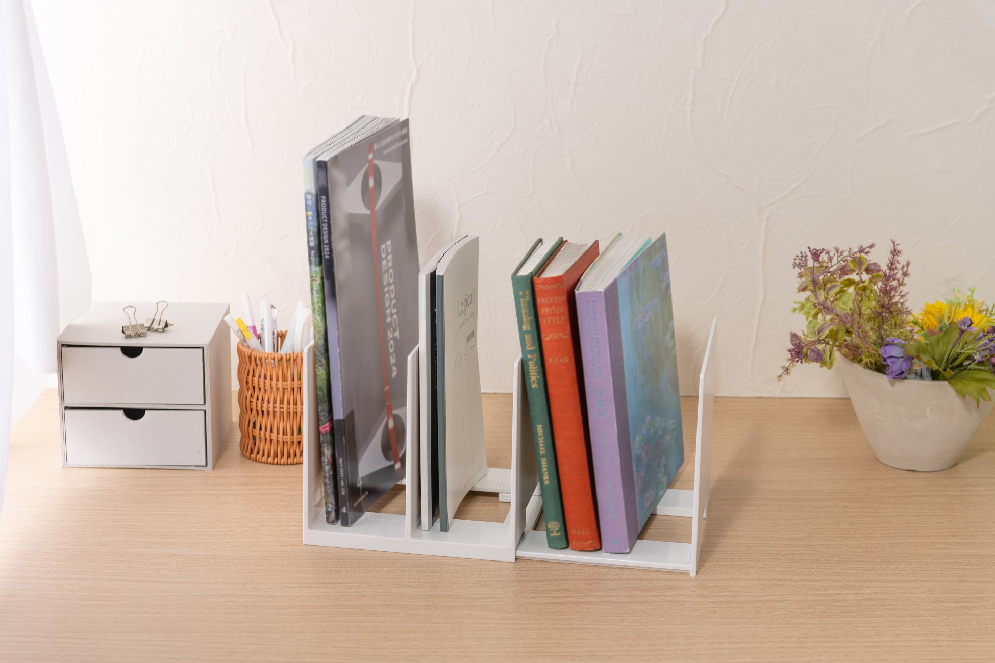 底部には凹凸の滑り止めがあり、冊数が少なくても安定して立てられます。本や雑誌はもちろんPCやキッチン用品などの整理にも便利です。