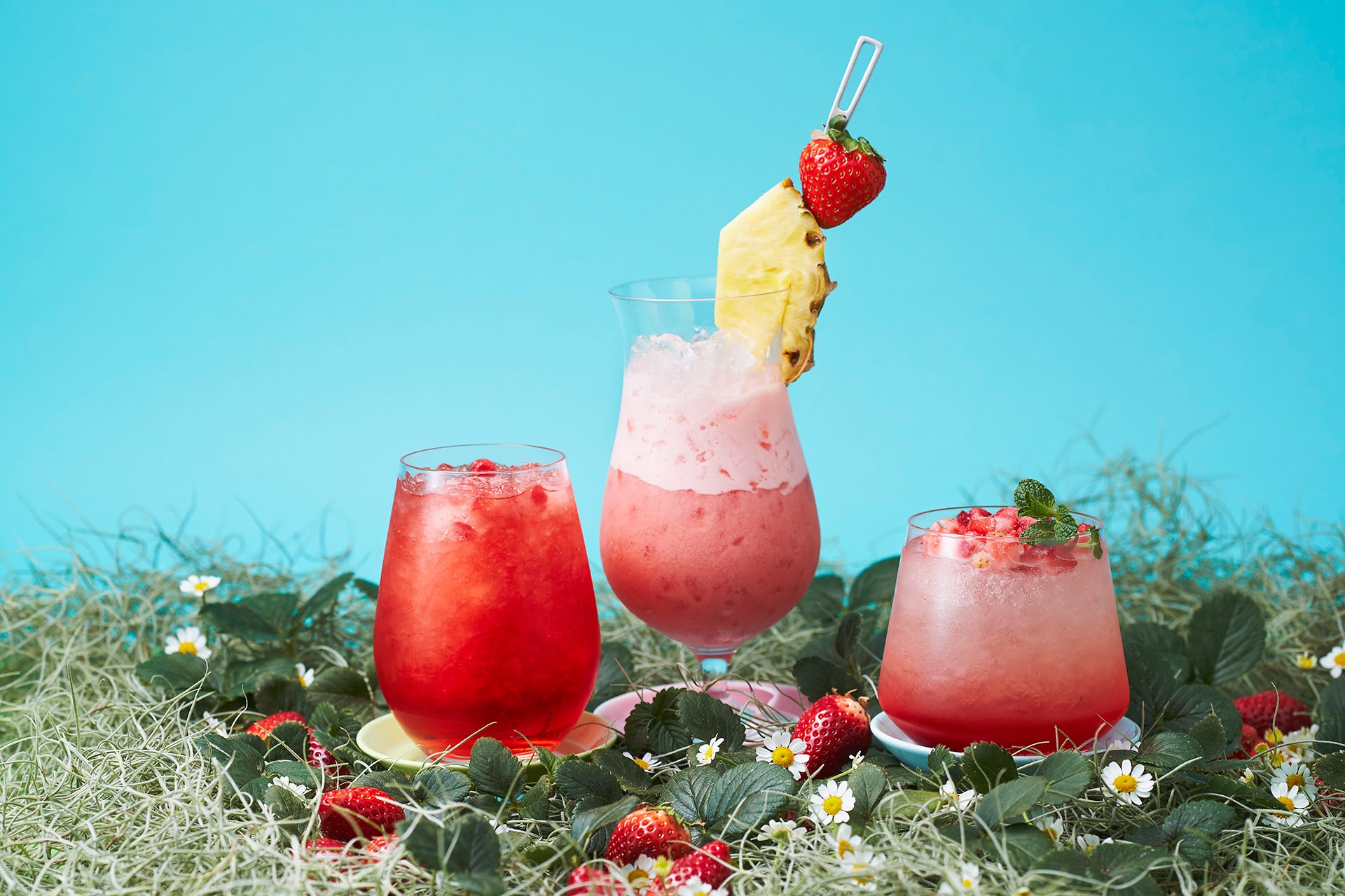苺を使った“赤×ピンク”の色合いが愛らしい3種のカクテルを販売。
