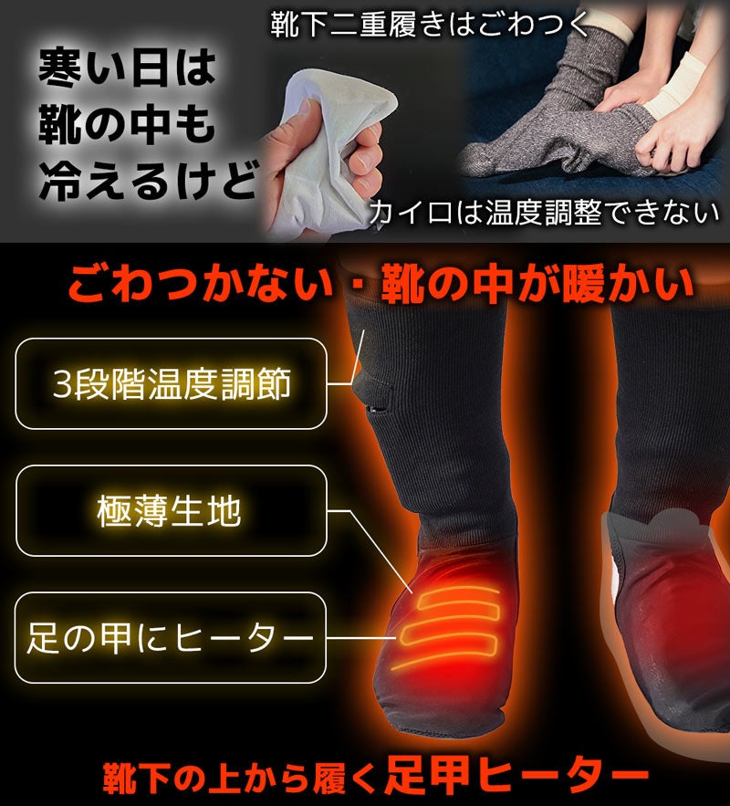 本製品は靴下の上に履くヒーター内蔵の靴下型足甲ヒーターです。