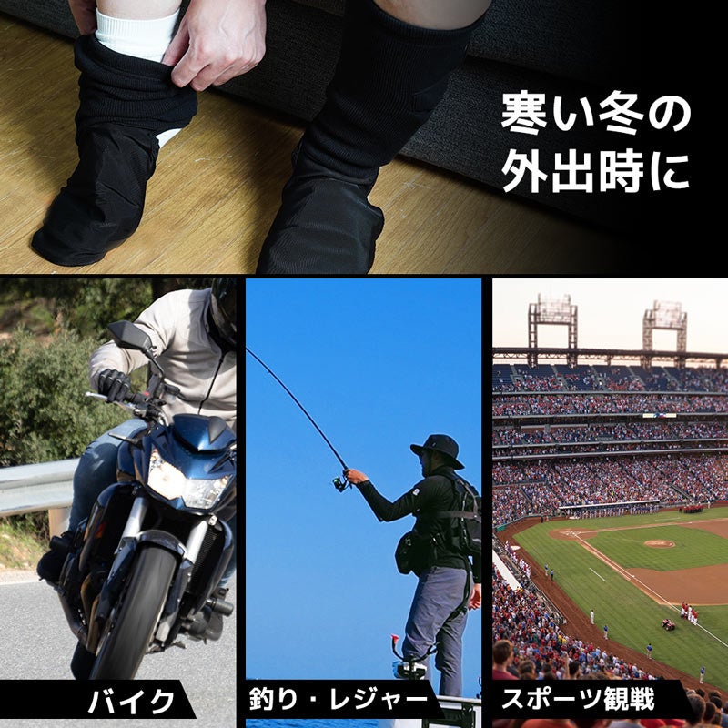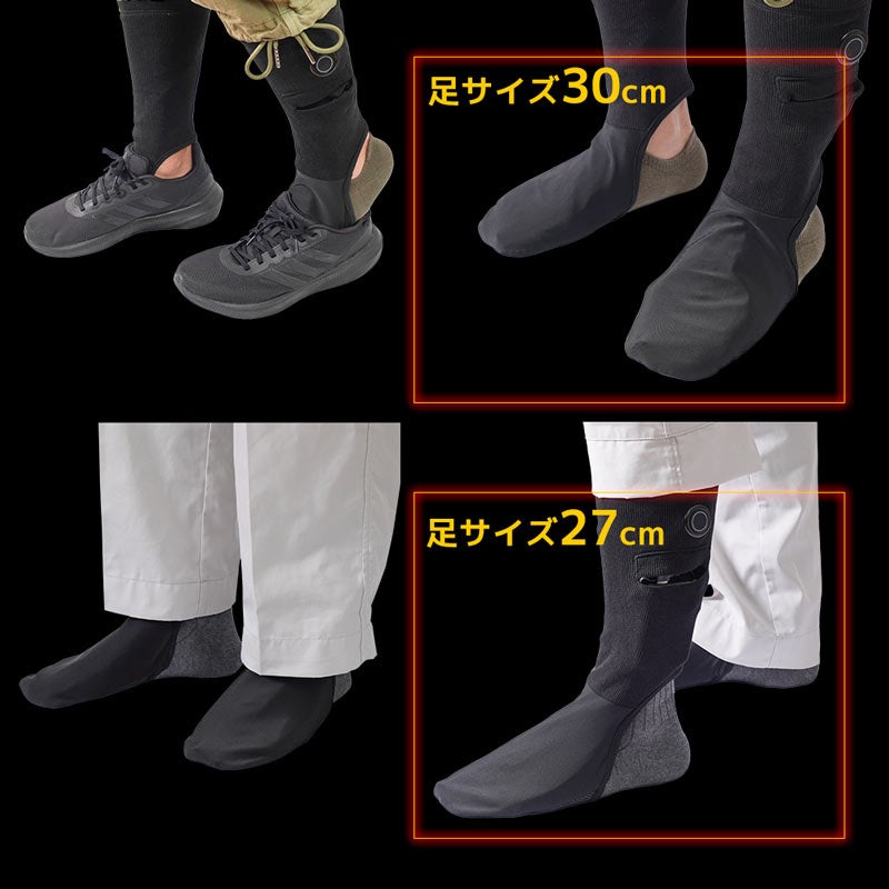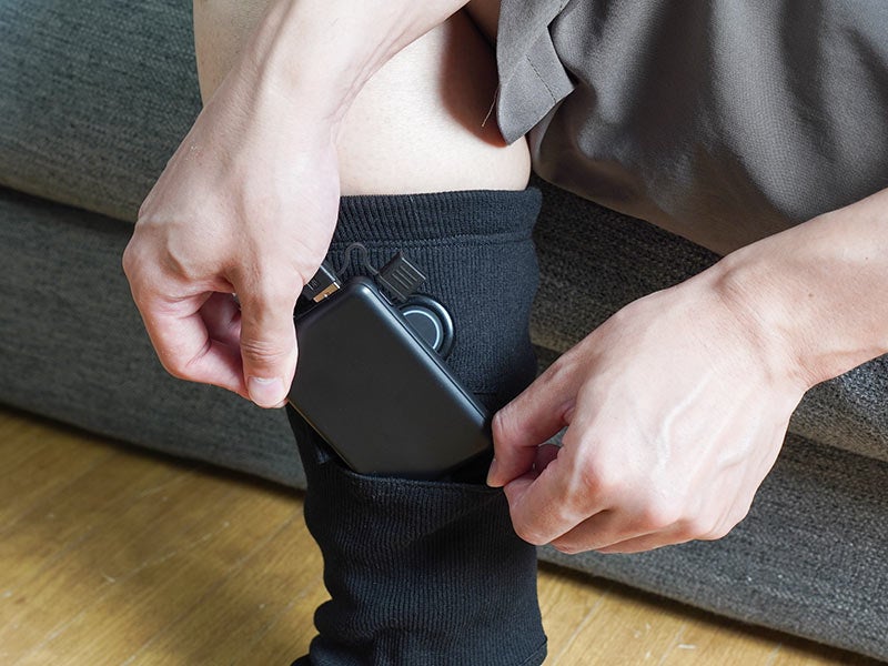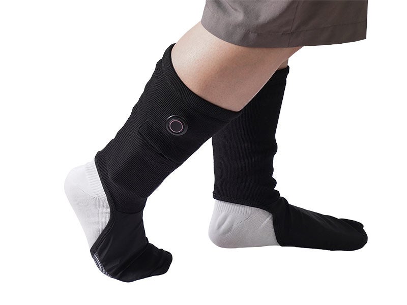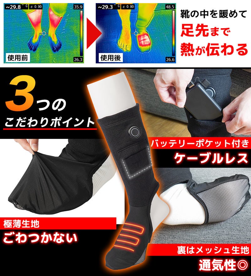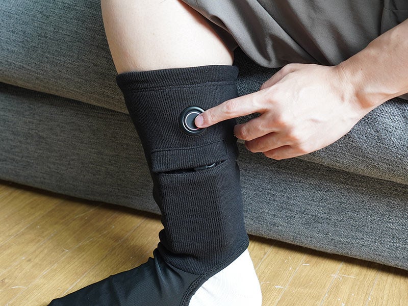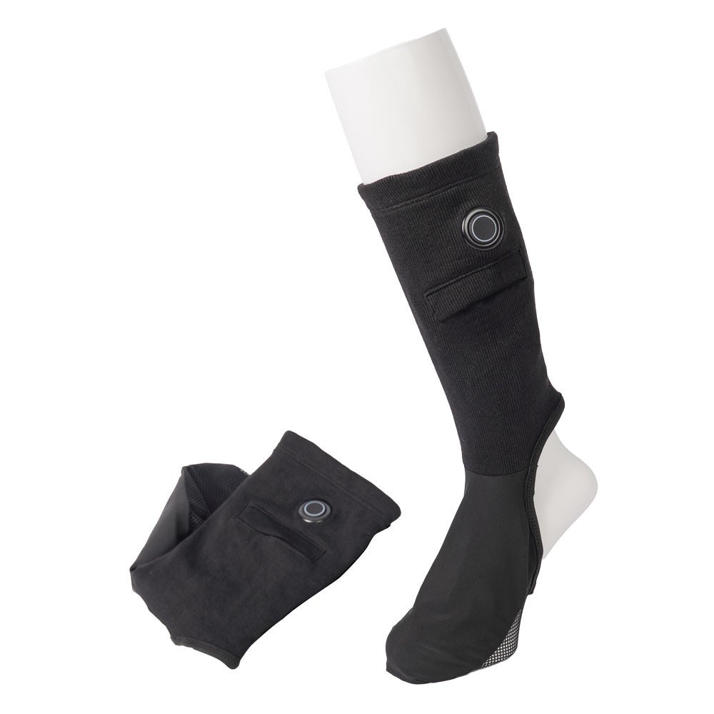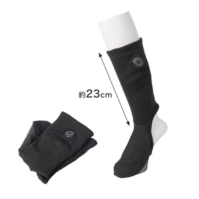 対応する足のサイズ24~30cm。USB給電式でモバイルバッテリーを入れるポケット付(ポケットサイズ縦12×横9(cm))。足の甲部分にヒーターを内蔵。すね部分の電源ボタンで押すと電源が入りヒーターが温まります。電源ボタンで3段階の温度調整が可能(強(約42℃)、中(約38℃)、弱(約35℃))。連続稼働時間は5000mAhのモバイルバッテリー使用時に強約2.5時間、中約4時間、弱約10時間動作。