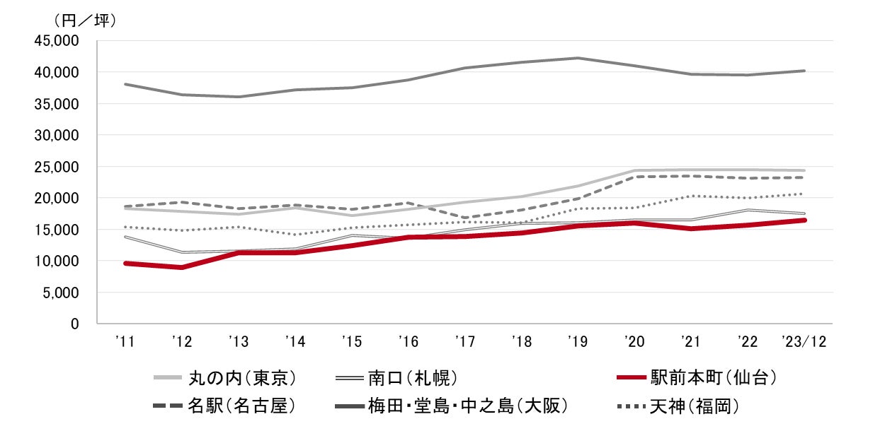 2023年の新規供給は約1.5万坪の大量供給だったが、2024年は約4千坪に止まる見込みとなっている。2024年第1四半期に竣工予定の建築中ビルは概ね順調にテナント誘致が進んでおり、第2四半期以降は供給予定が無い。昨年竣工したビルへ移転したテナントの二次空室も空室率に影響を及ぼす程の水準とはなっていない。足元のオフィス需要は堅調であり、既存物件でも順調に空室消化が進んでいることから、需給バランスは比較的引き締まった状態で推移する可能性が高い。(仙台支店長 関根洋一)