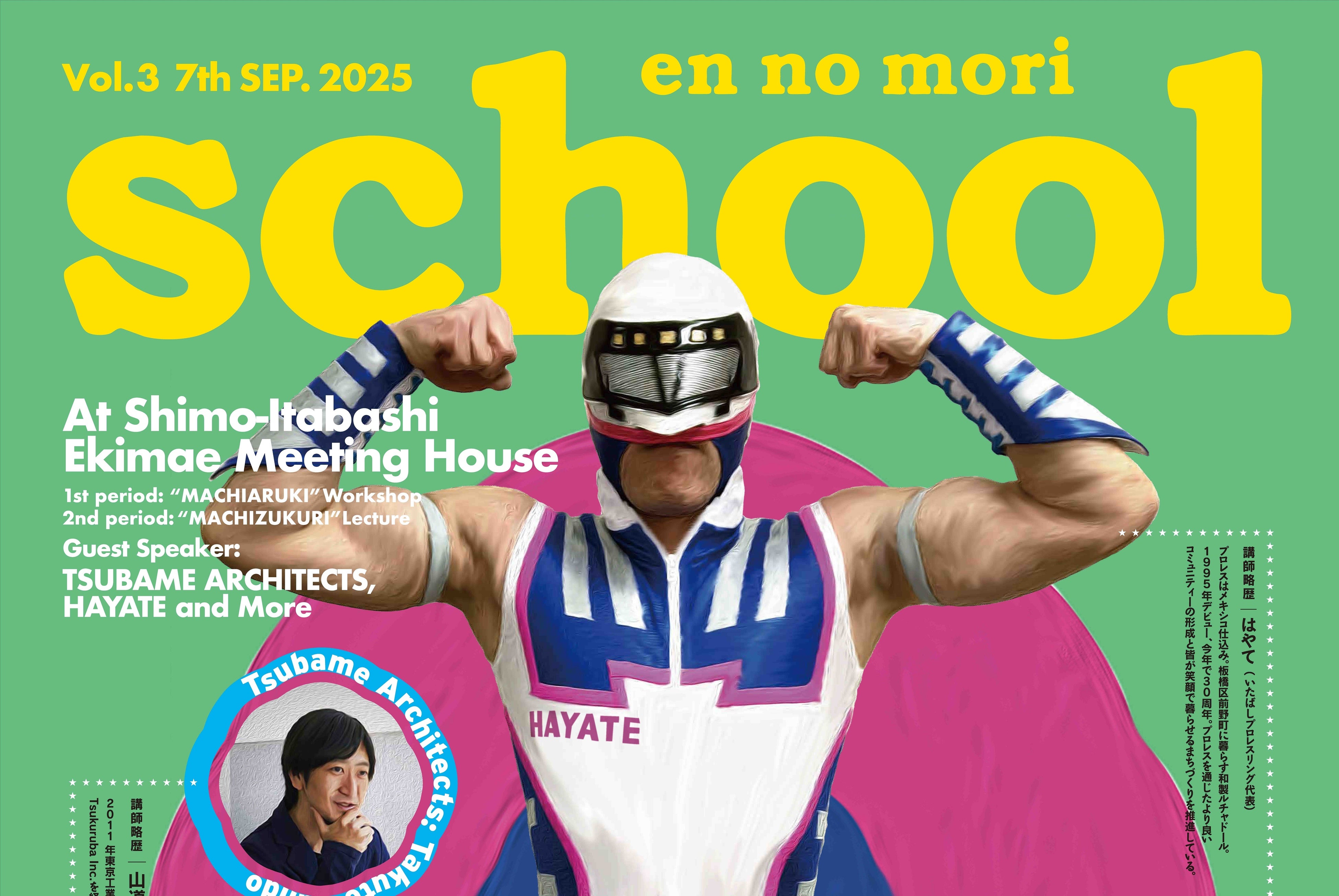 内容:板橋口地区再開発ビル4階の公益施設の設計者であるツバメアーキテクツから、山道拓人さん、今年デビュー30周年を迎えた「いたばしプロレス」の主催者である、はやてさんの2名による講座です。他地区の事例を踏まえた建築の視点から考える公益エリアのあり方や、プロレス事業の中で紡いだ人の心や関わりについて、それぞれお話しいただき、得られた学びを板橋駅前の「えんのもり」の仕組みづくりに活かしていきます。