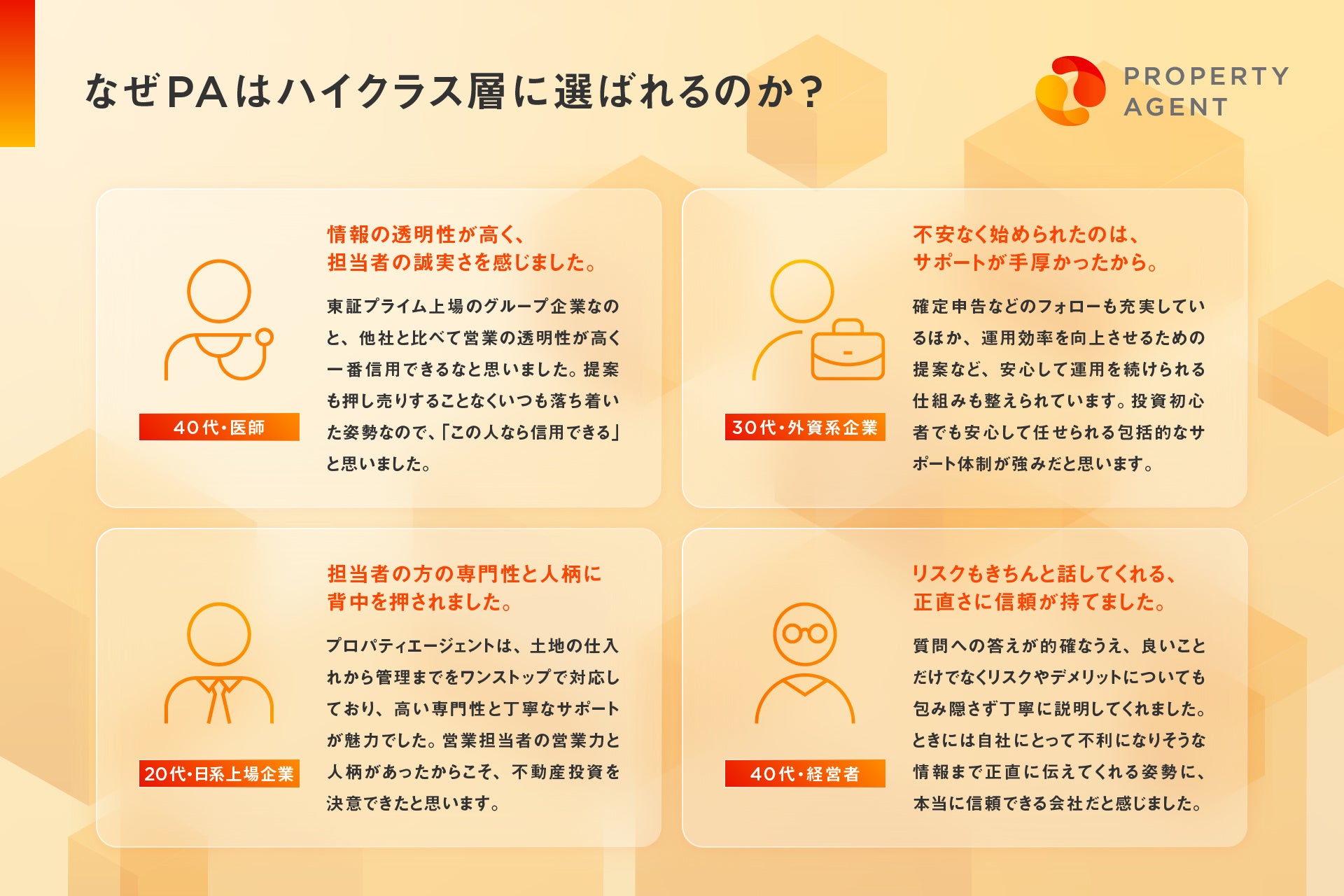 PAが選ばれる背景には、企業としての信用力やアフターフォロー体制に加え、担当エージェントの誠実な姿勢があることが明らかになりました。表面的な利回りだけでなく、「長く付き合える、信頼できるパートナーかどうか」を判断軸とされてPAを選んで頂いていることがうかがえます。